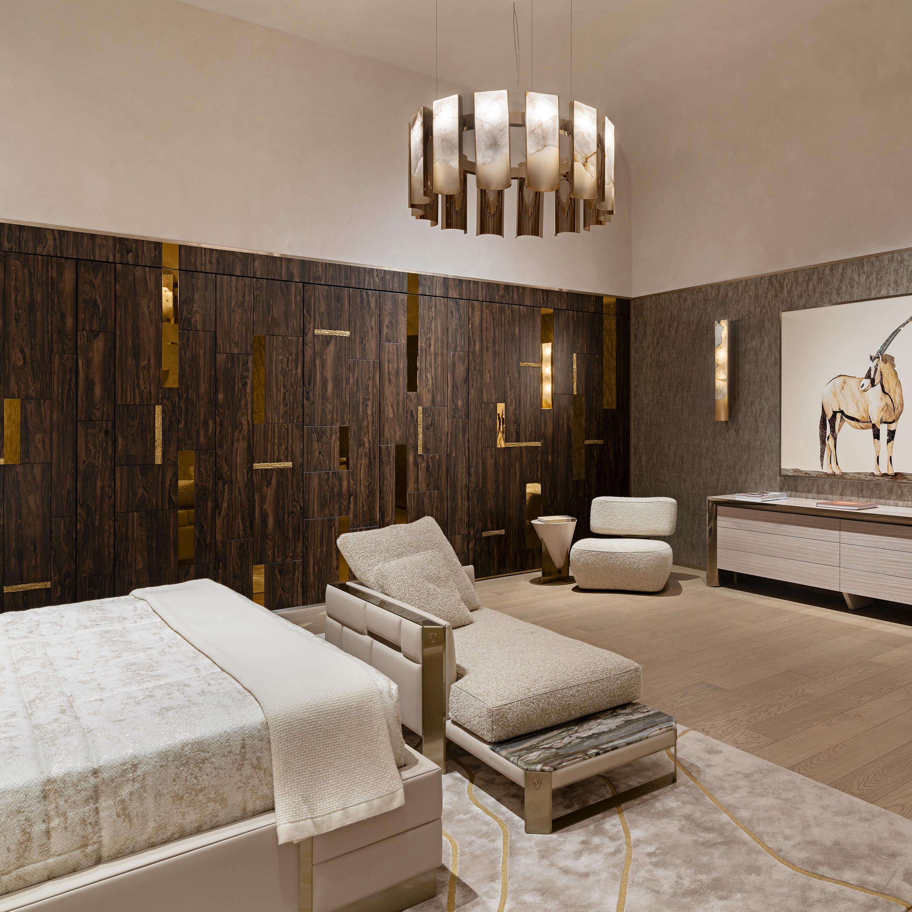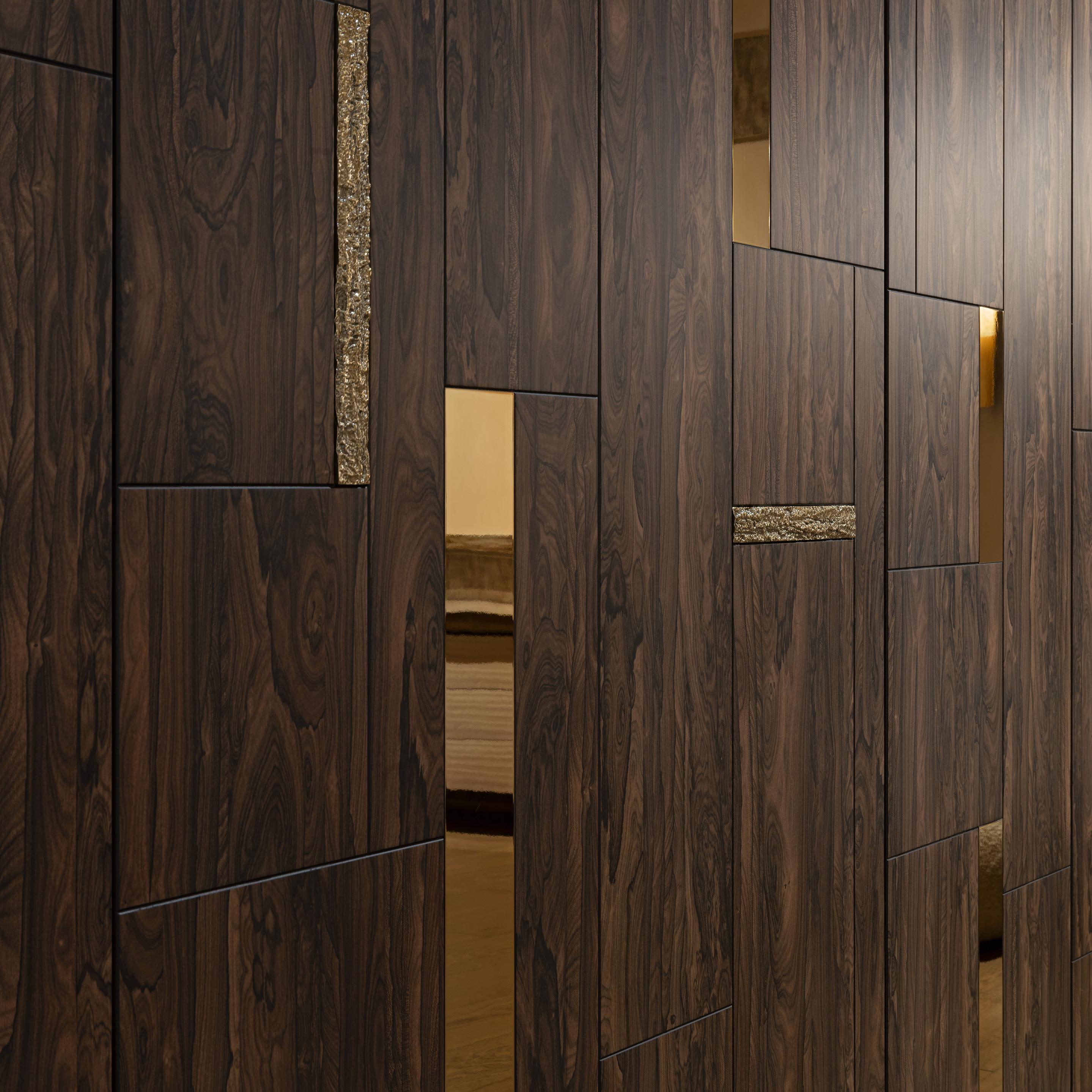 The concealed wall system adopts a plywood base, covered with polished and aged stainless steel collages, and decorated with handmade cast aluminum "bark" texture inserts. Electric retractable doors conceal spaces or passages, with no mechanical traces when opened or closed, and can also be covered with wooden veneers.