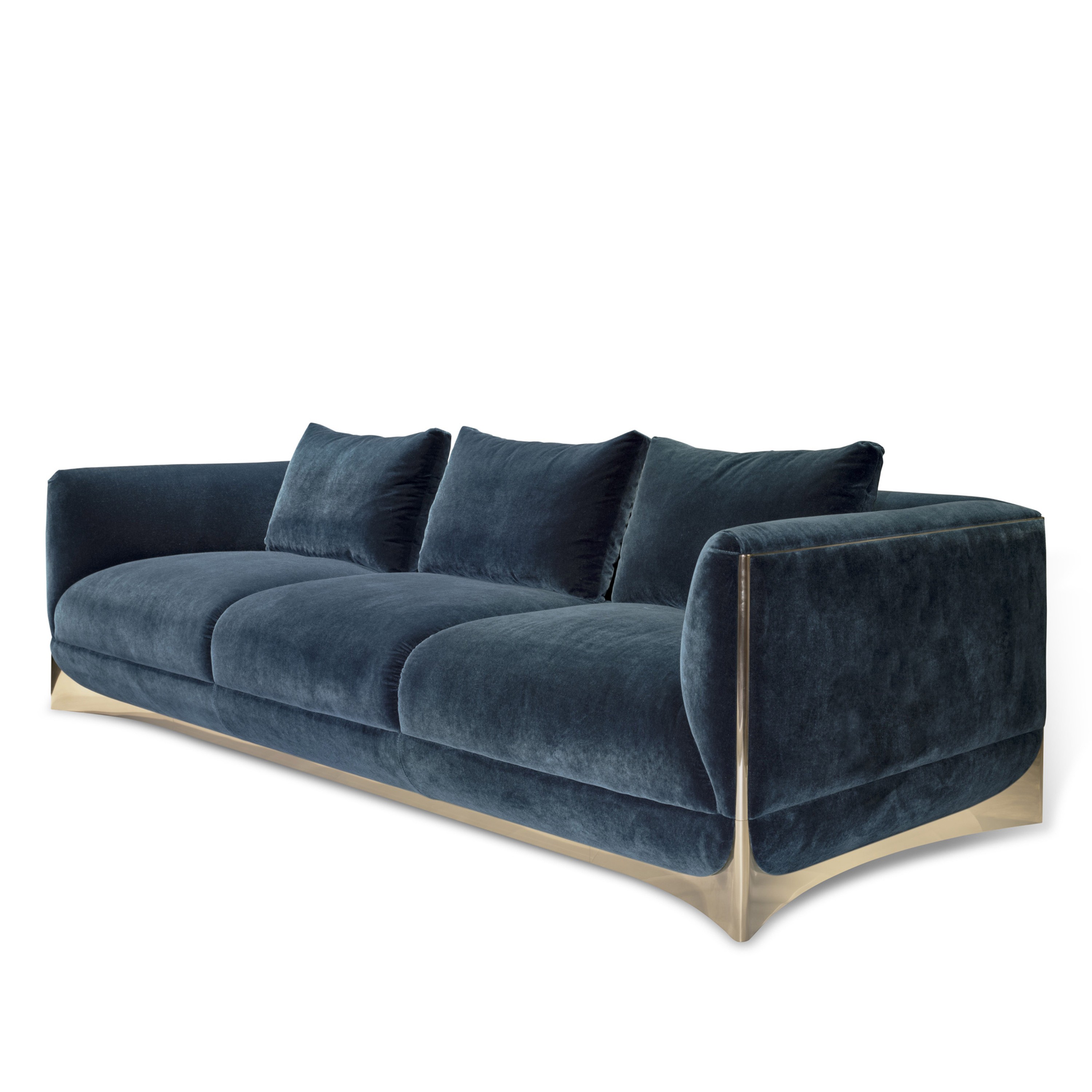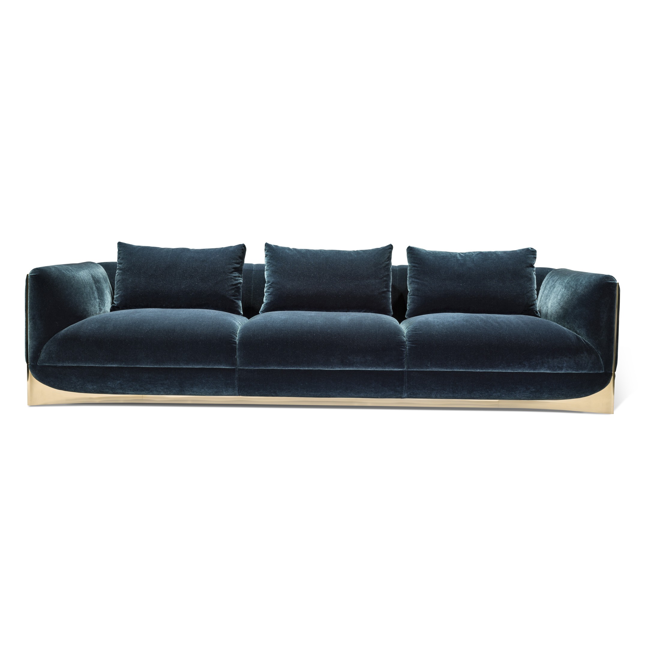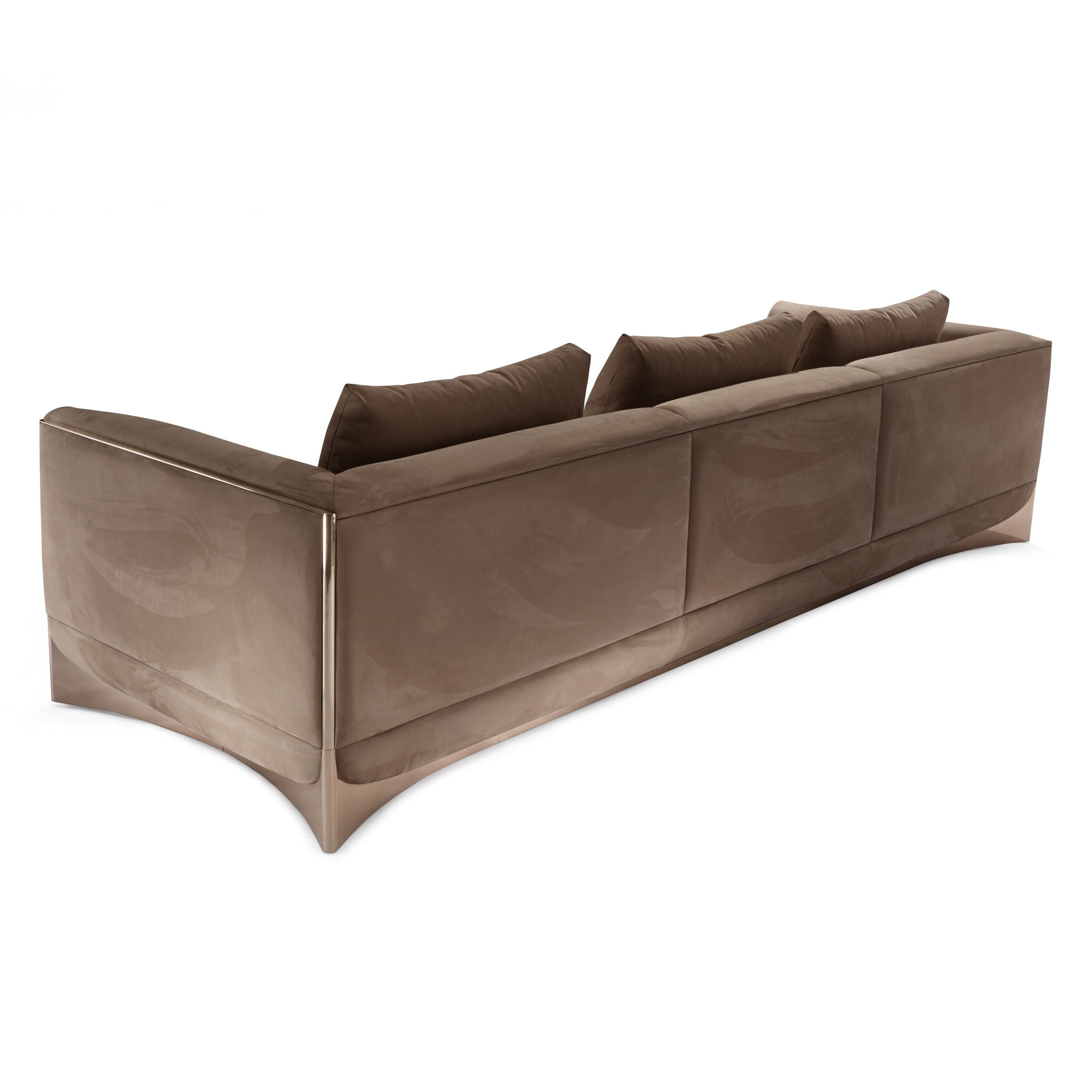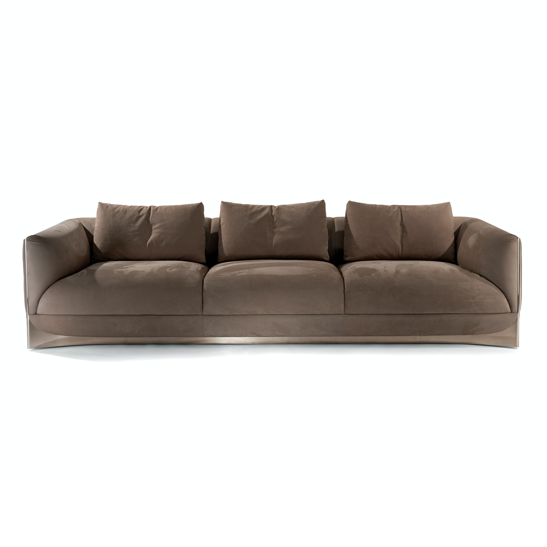 Modular sofa with fixed upholstery in leather or fabric, built on a solid and multilayer wood base with elastic webbing suspension. The shell composing the armrests and backrests is generously padded, while seats and back cushions are crafted from multi-density polyurethane and feather. The contoured base and side profiles are finished in polished steel.