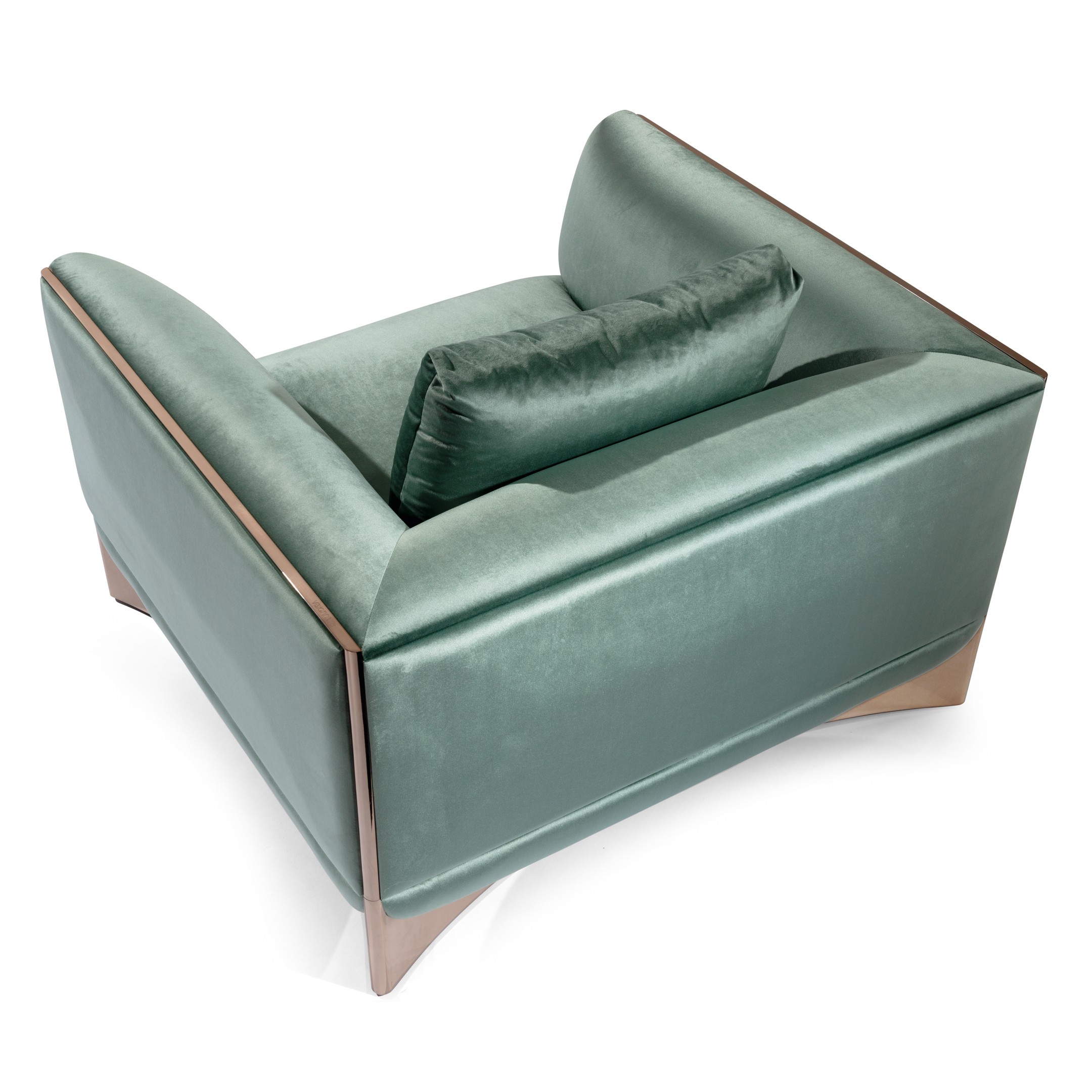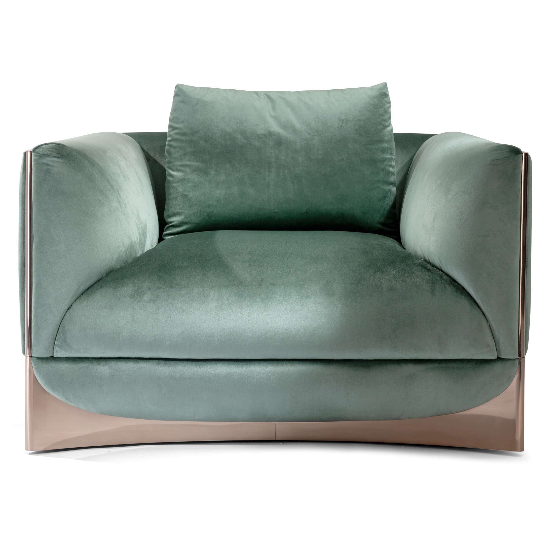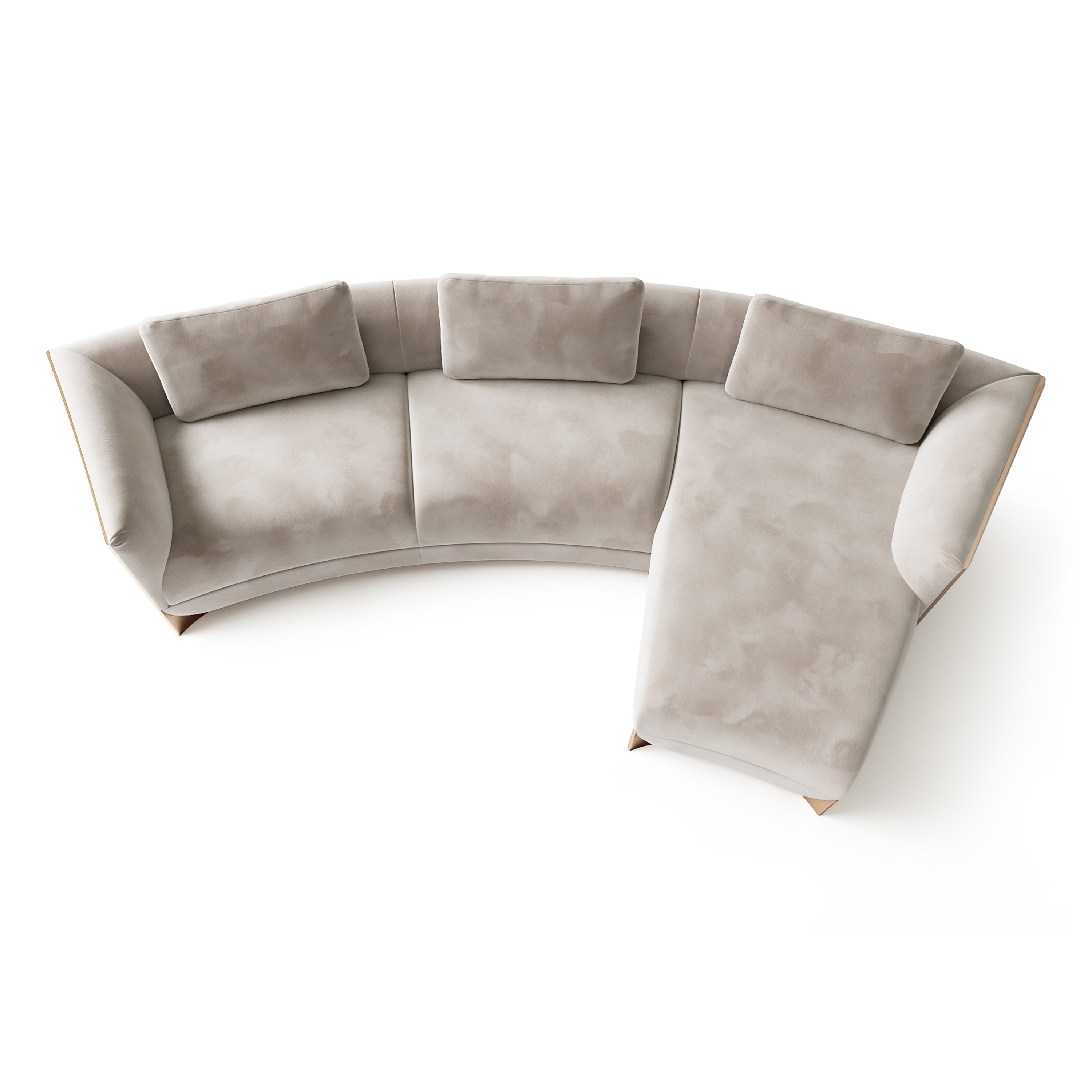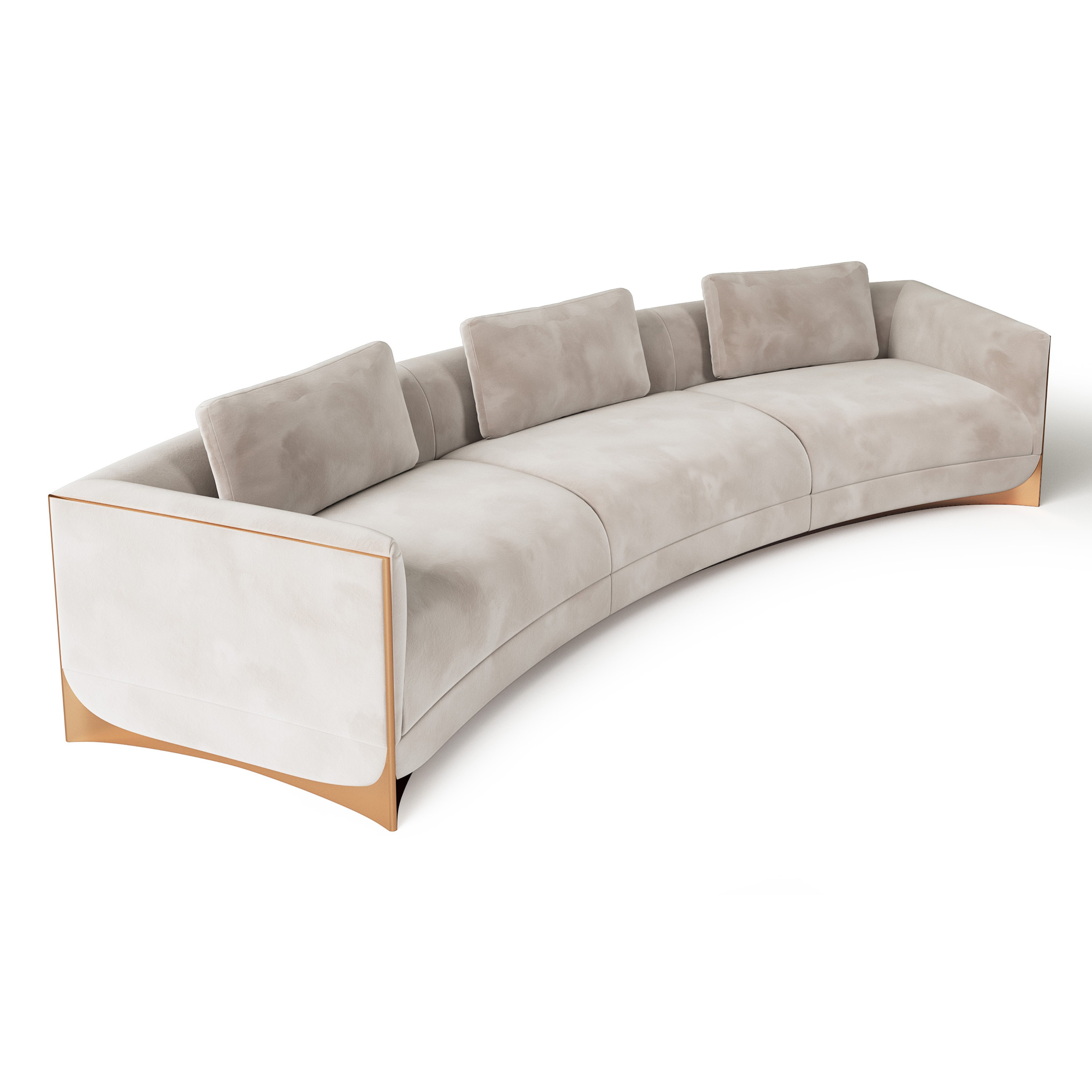 Modular sofa with fixed upholstery in leather or fabric, built on a solid and multilayer wood base with elastic webbing suspension. The shell composing the armrests and backrests is generously padded, while seats and back cushions are crafted from multi-density polyurethane and feather. The contoured base and side profiles are finished in polished steel.