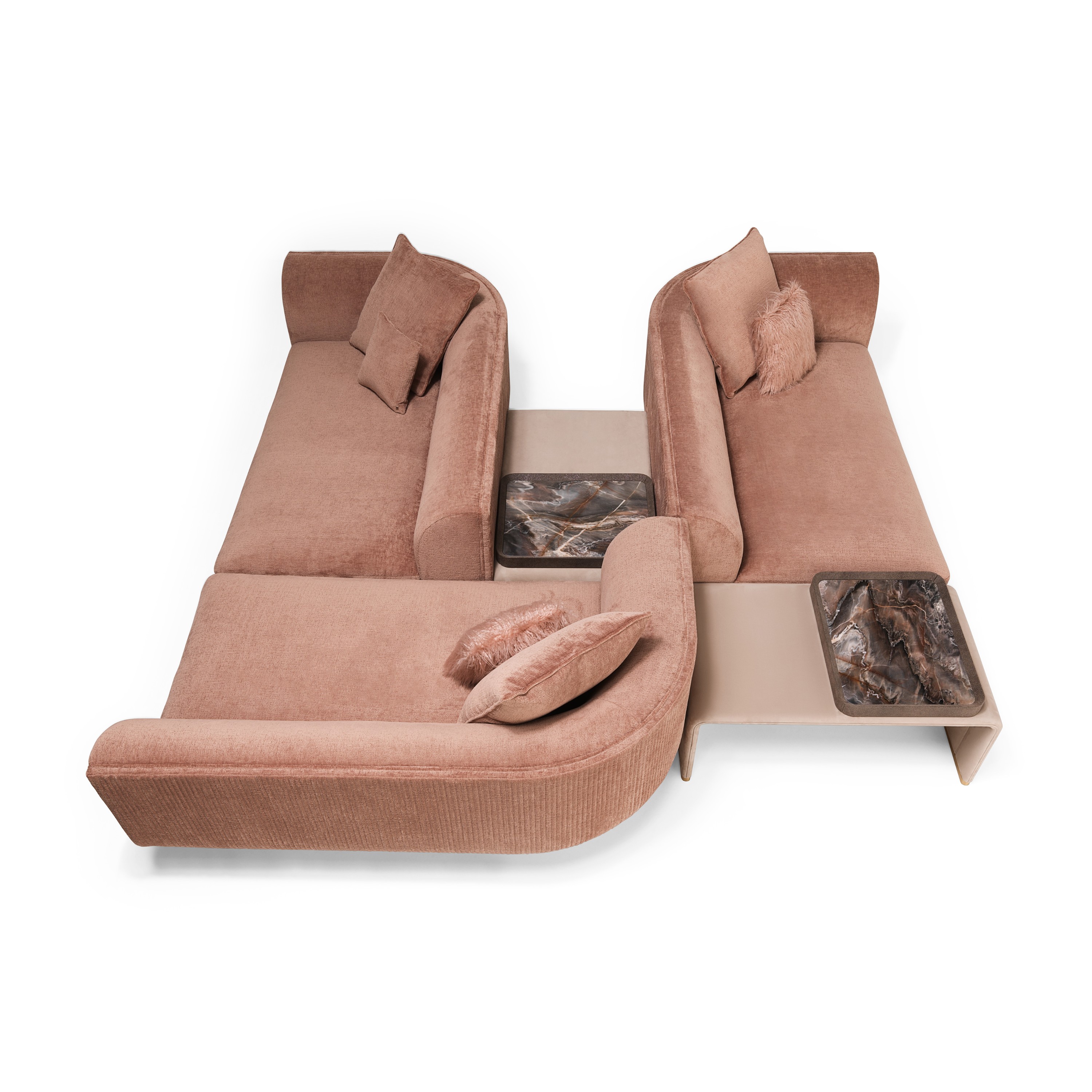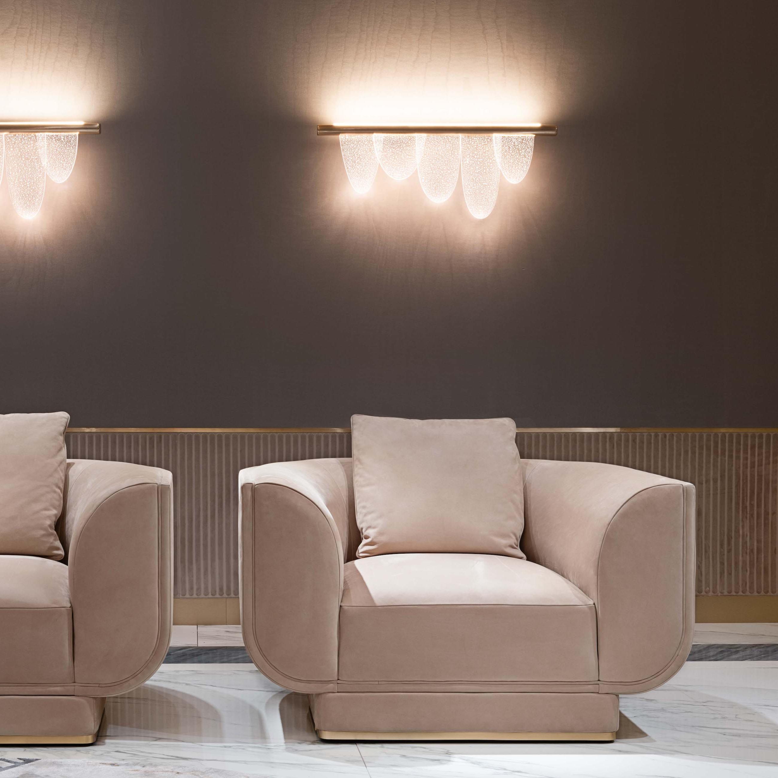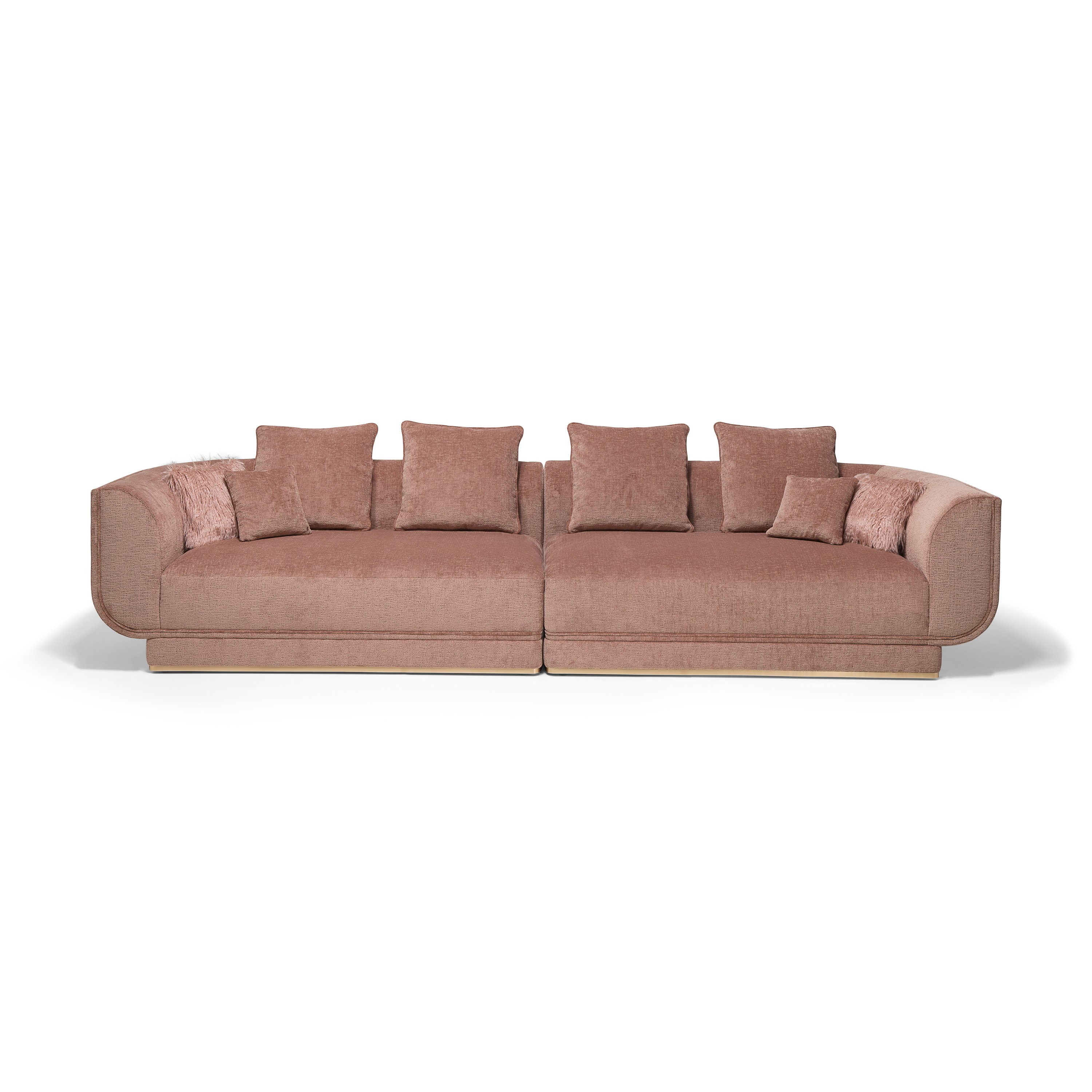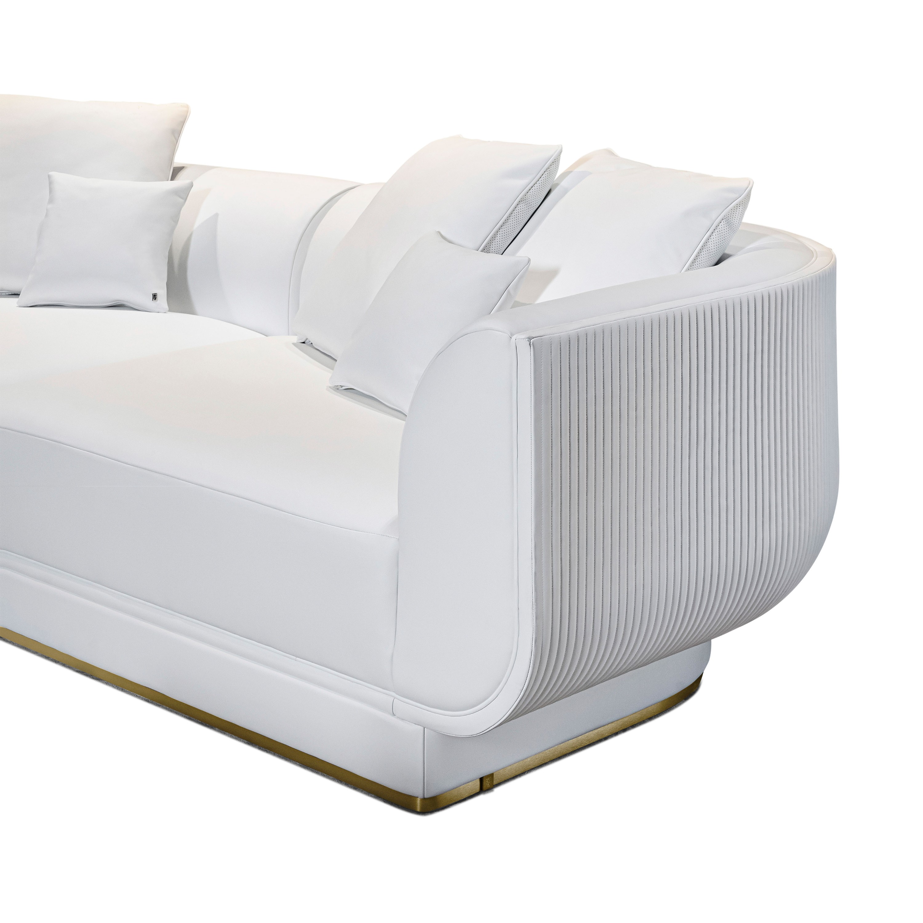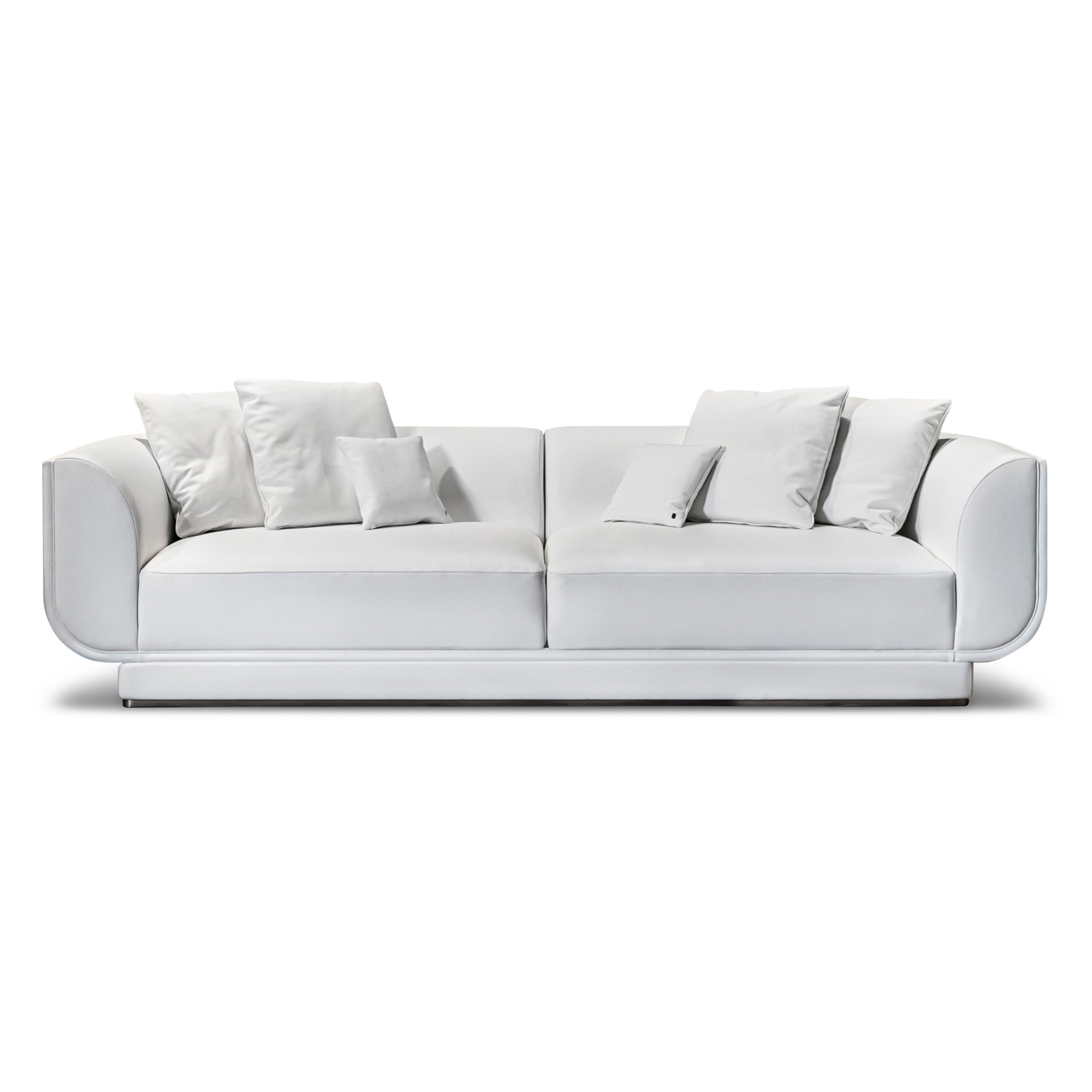 Upholstered in leather or fabric, with a solid and multilayer wood shell defined by continuous, curved volumes. While multi-density polyurethane padding ensures lasting comfort. The back cushion is filled with feather, and the exterior is finished with vertical canneté stitching. The self-aligning swivel base rests on a stainless steel plinth.