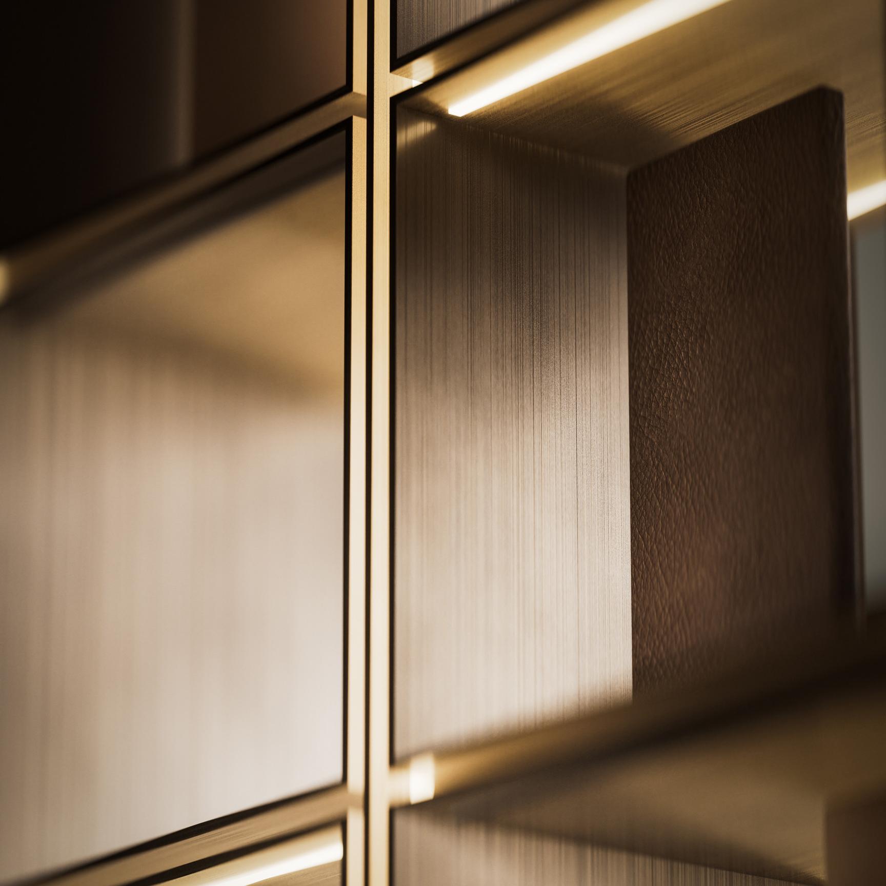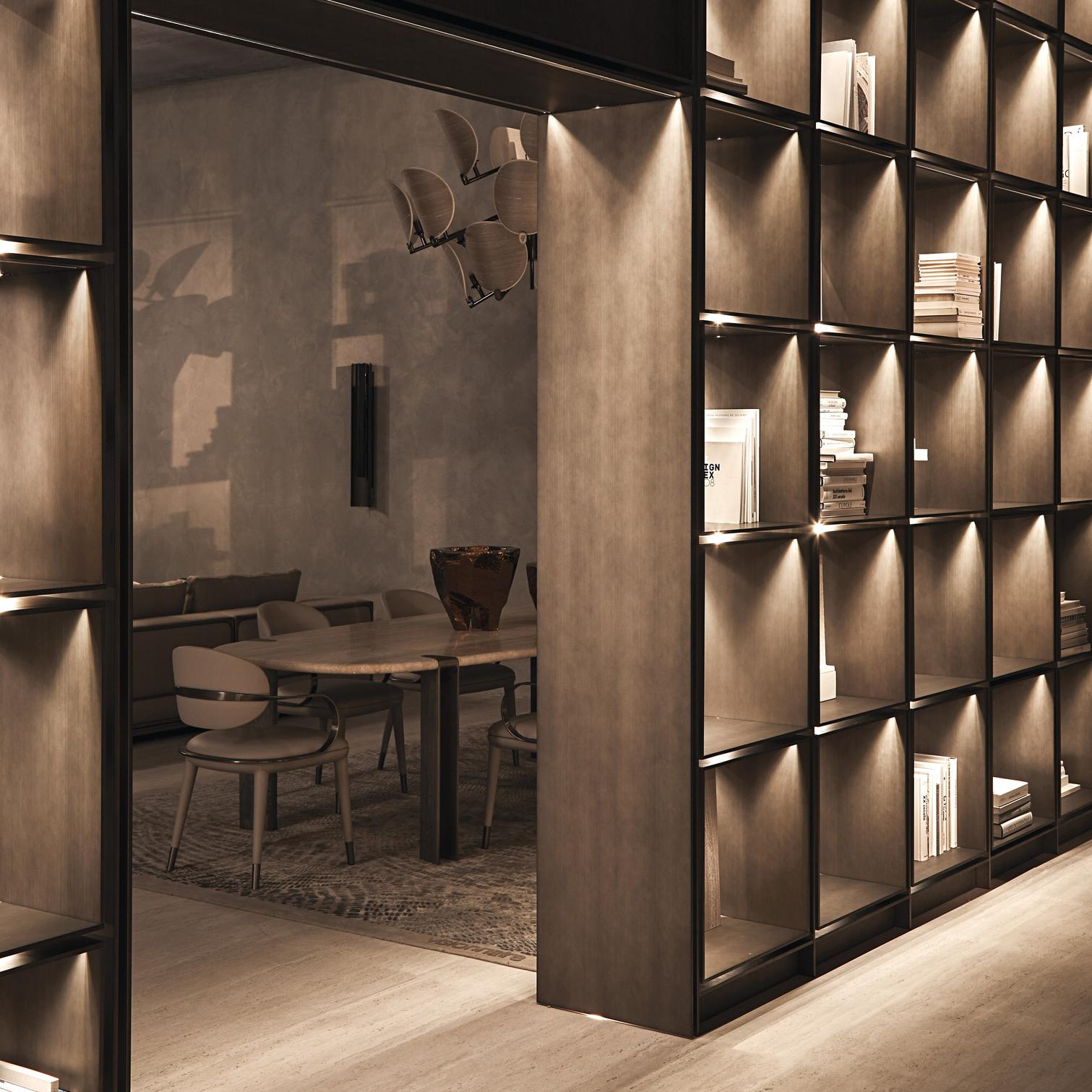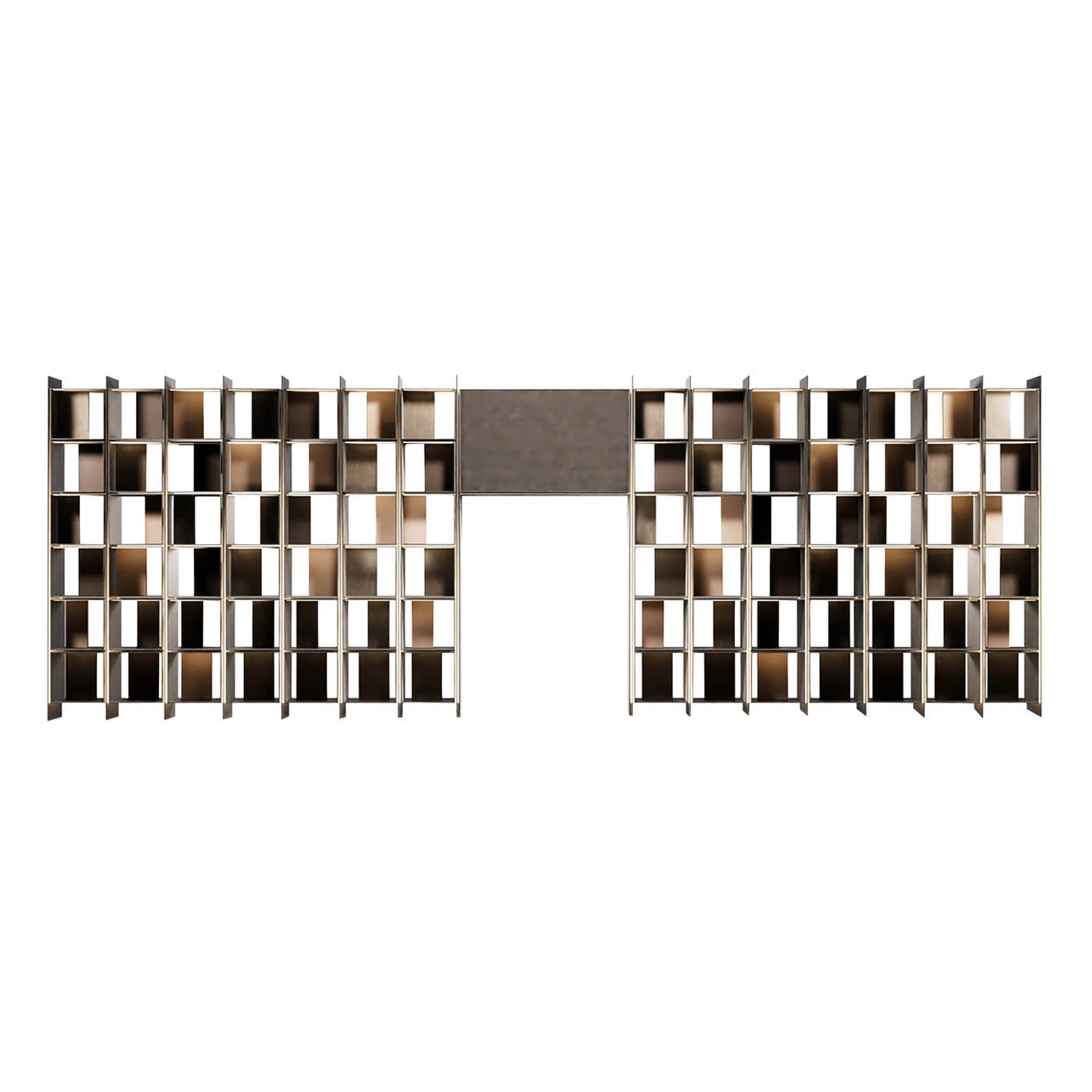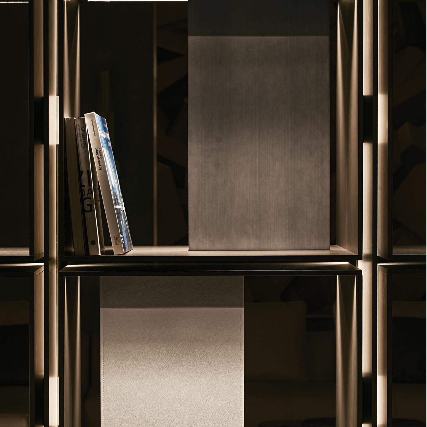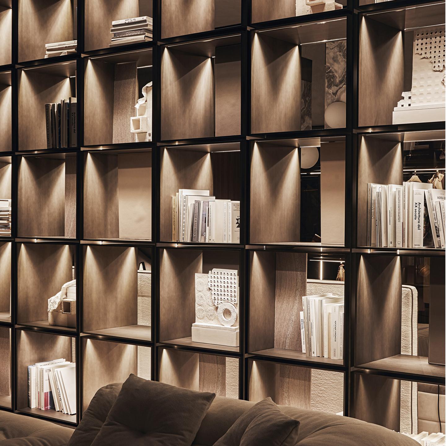 Modular aluminum system with integrated dynamic LED lighting. The square cells and vertical sides are fully illuminated. This system allows dynamically controlled lighting scenarios via a dedicated app or dimmable fixed light. Sustainable, made of 100% recyclable aluminum and free of wood materials. Available as a wall bookcase or center room divider.