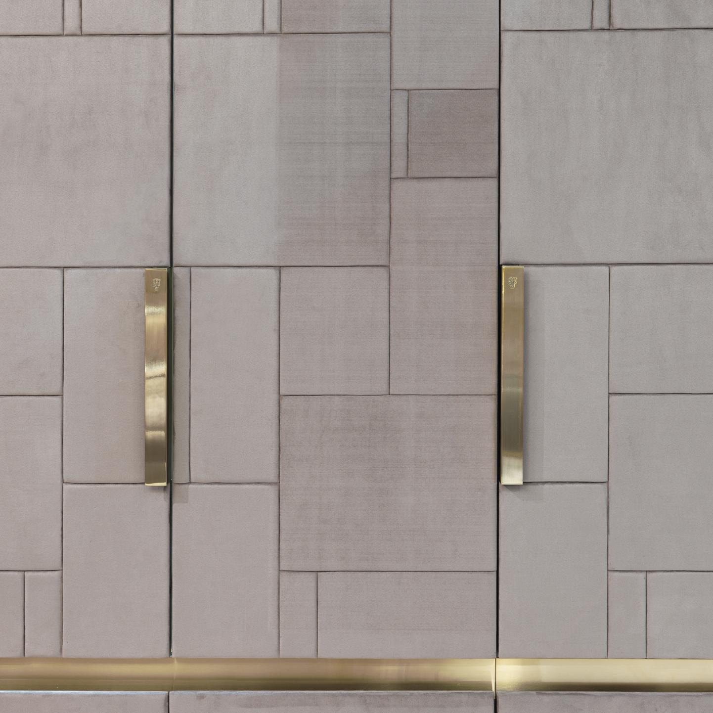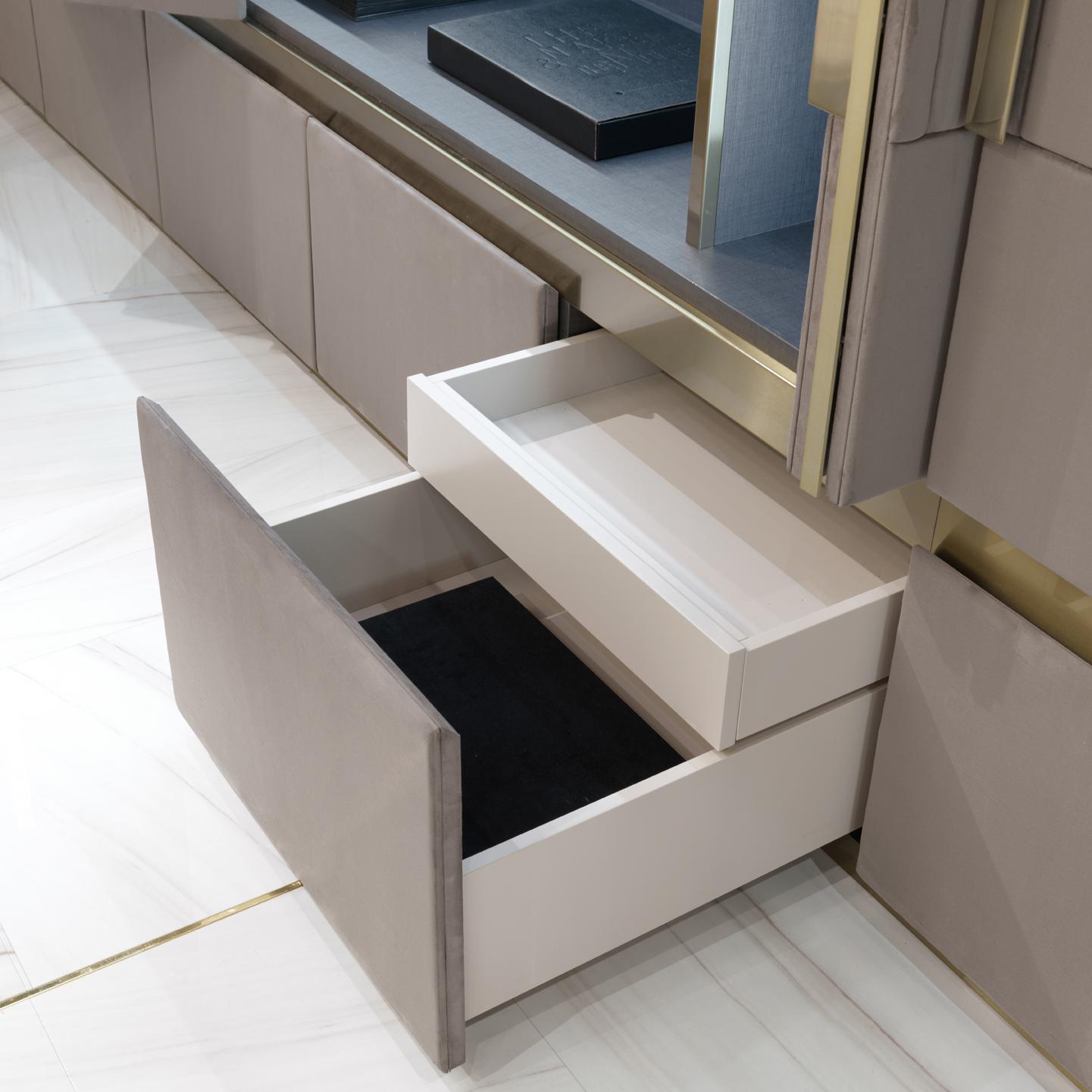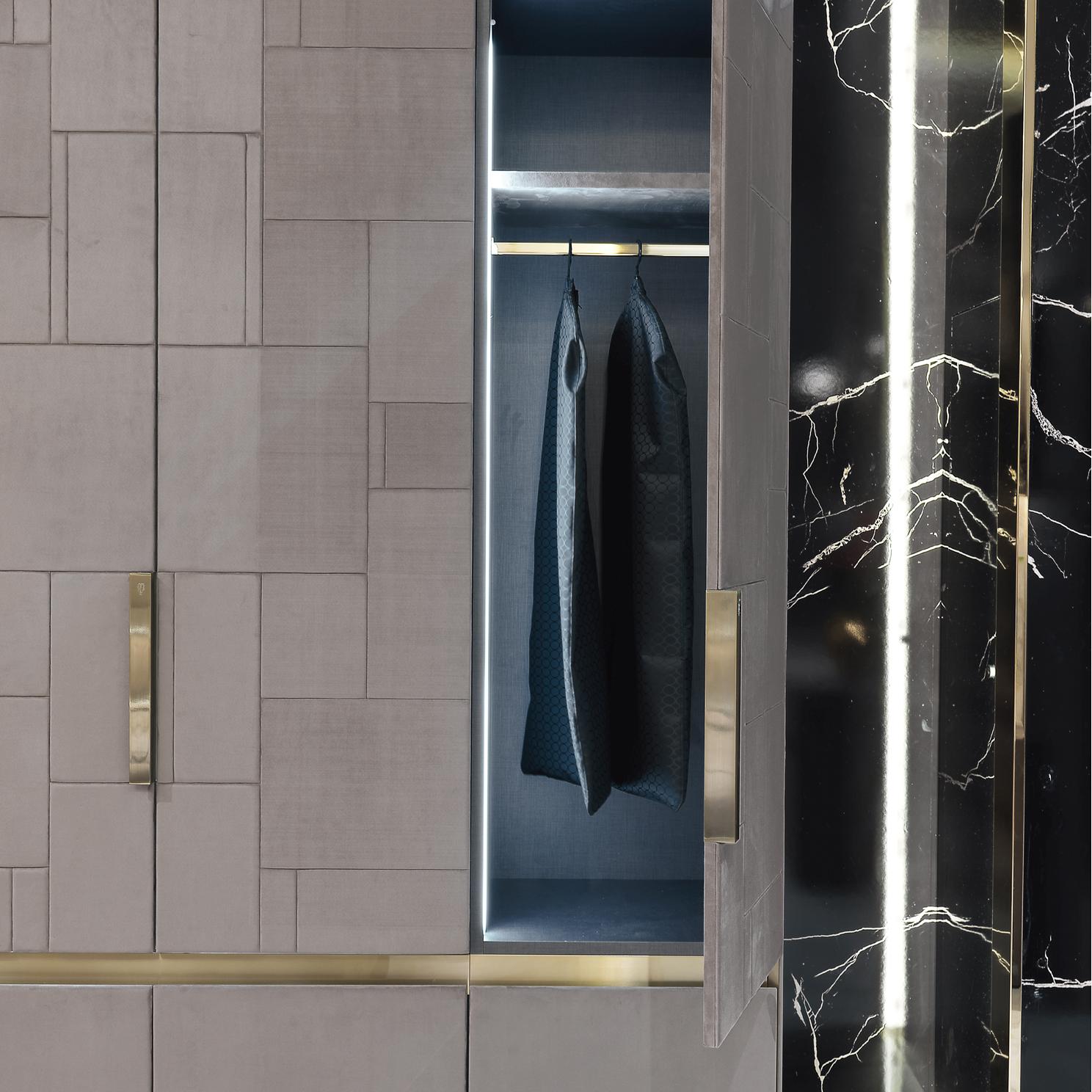 The wardrobe adopts a laminated structure, with the facade covered in leather or fabric, decorated with soft cushion geometric modules and steel details. The central storage area can accommodate four retractable doors and is equipped with a mirrored bookshelf or a 55 inch TV cabinet; Six large drawers are equipped with soft pack front panels and satin steel embedded handles. Optional internal LED lighting.
