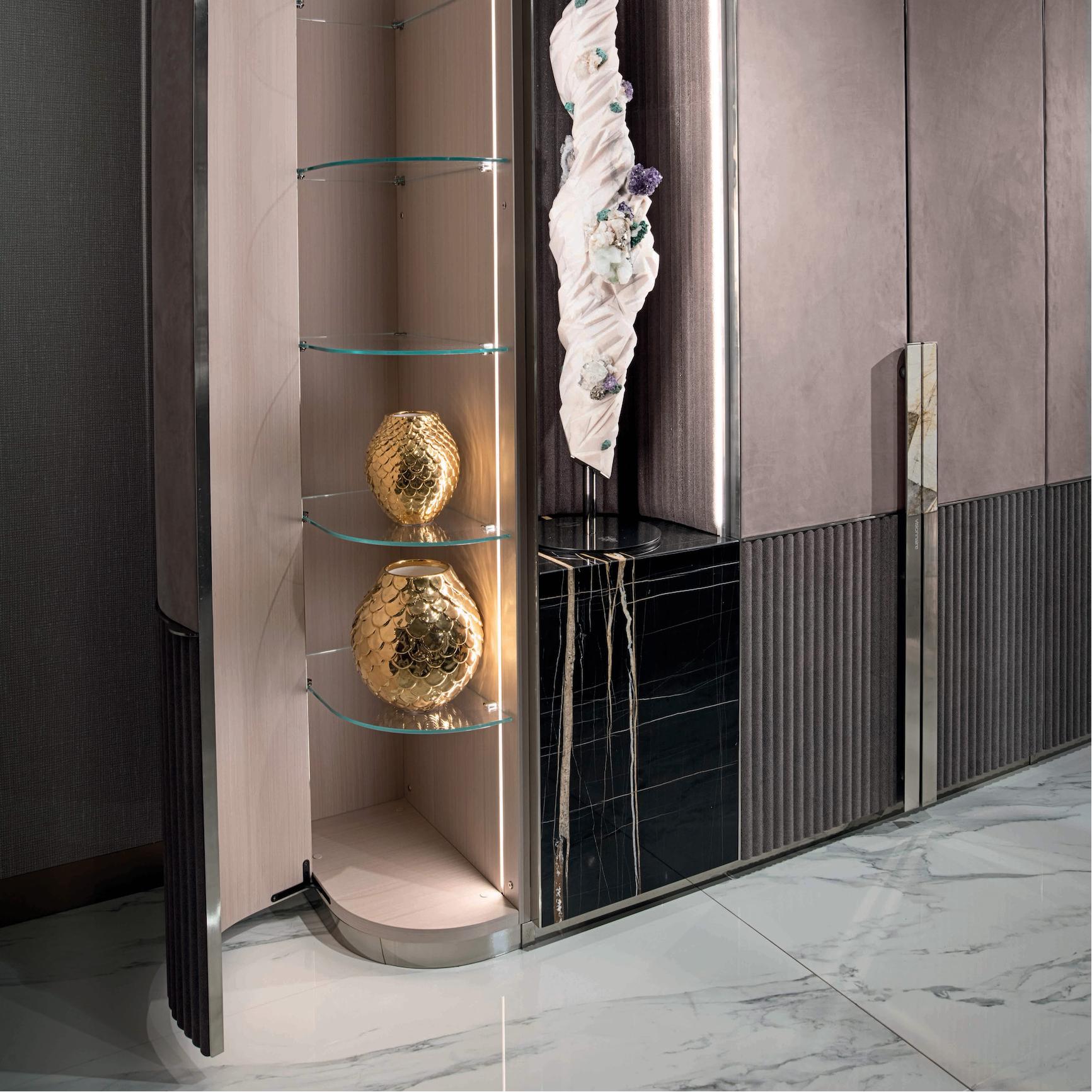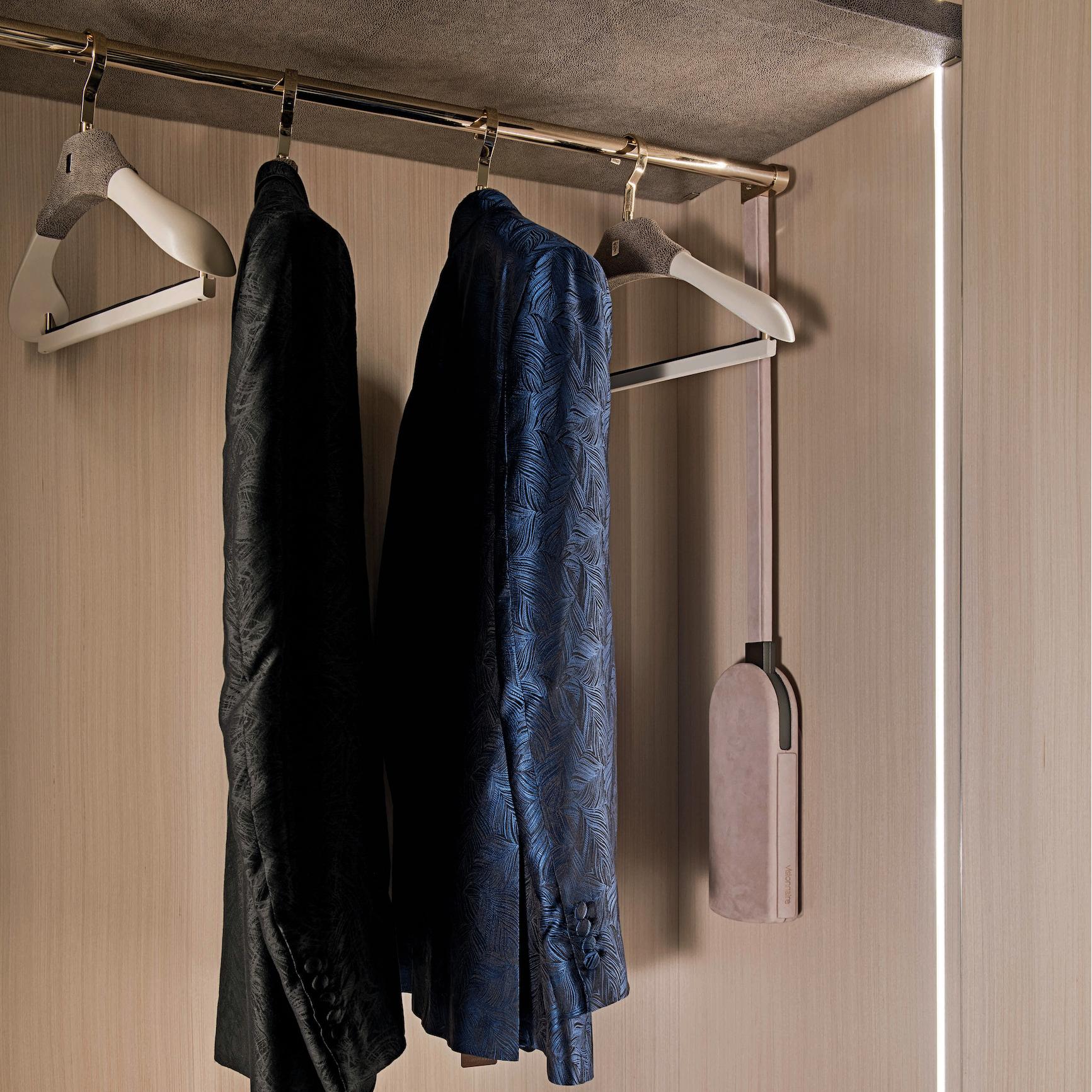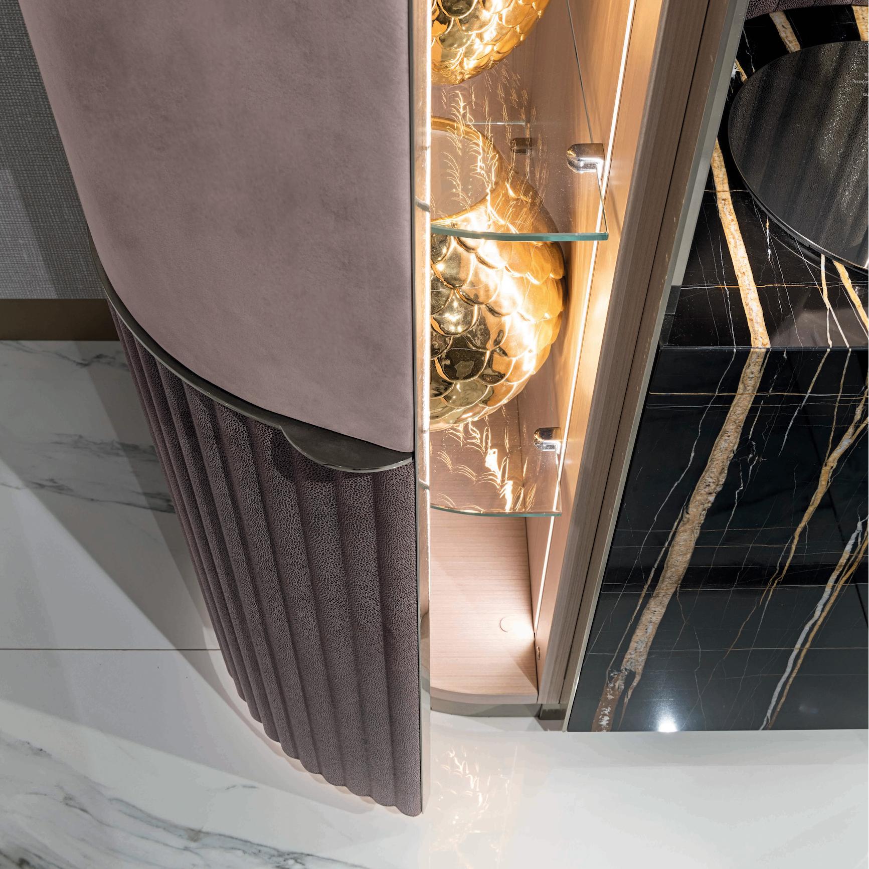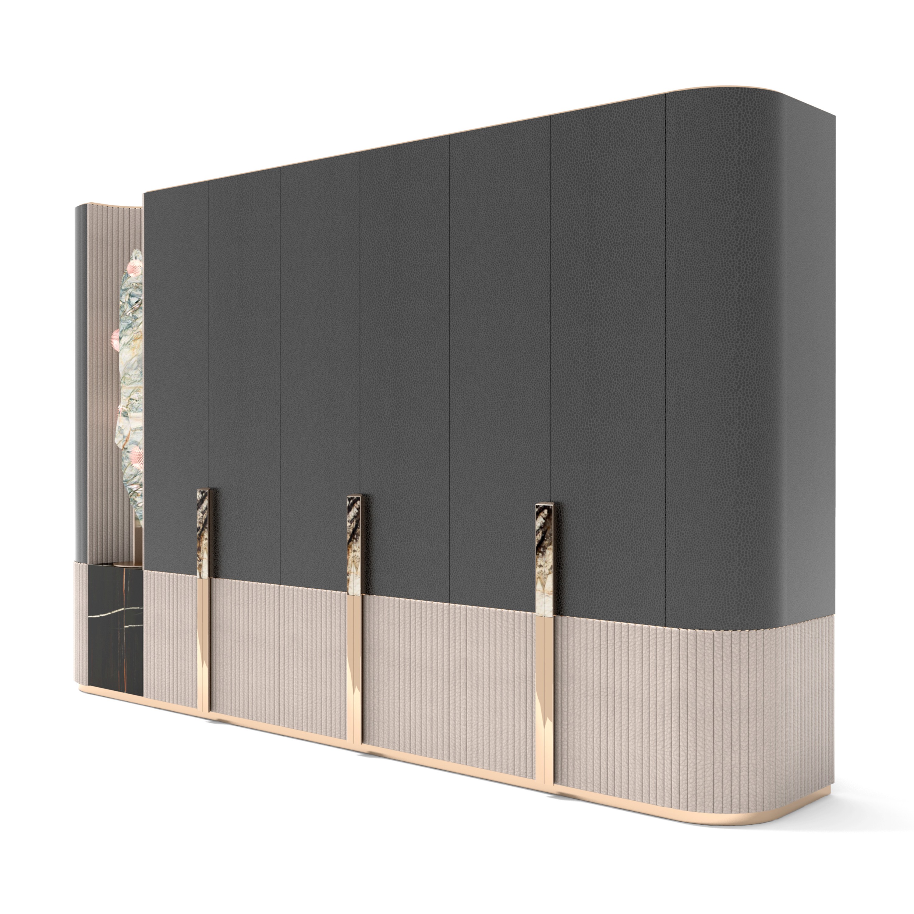 Wardrobe in wood and leather with doors featuring a dual finish: lower panels sculpted in low-relief “canneté” texture, either leather-clad or gloss lacquered, and smooth upper panels in contrasting leather. Vertical handles with marble insert, satin aluminum profiles, and a curved steel plinth. The interiors are veneered with leather-covered drawers and shelves, completed on request with LED lighting and an optional display niche.