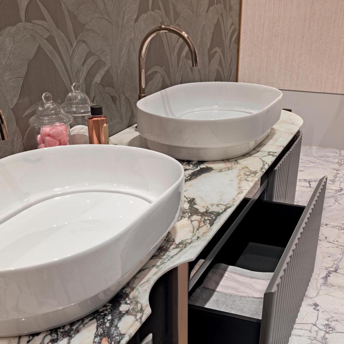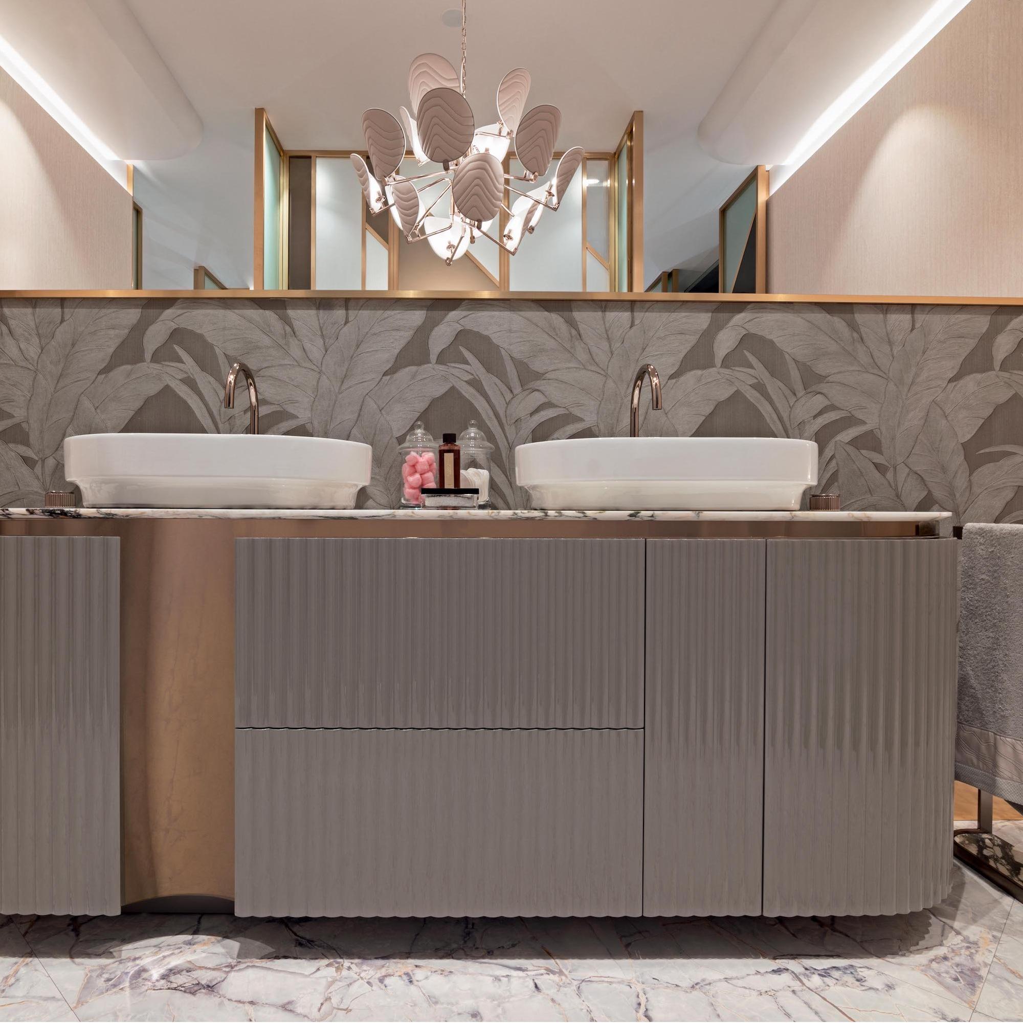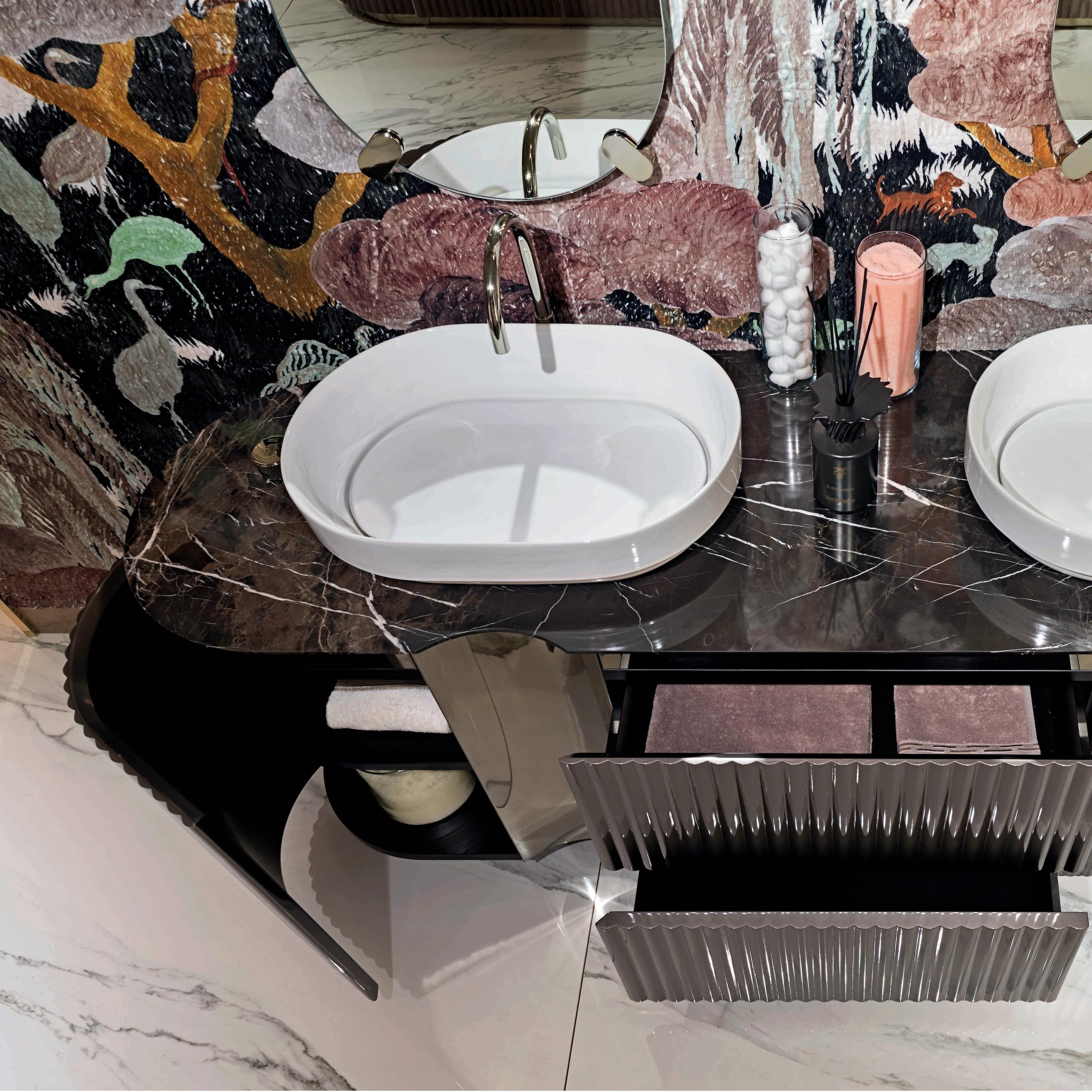 This luxurious bathroom cabinet, with its stainless steel gold base and marble countertop, dual wash basin design, meets the needs of multiple people using it simultaneously. The marble countertop provides an elegant appearance and durable surface, making it easy to maintain. The storage cabinet under the sink is designed reasonably, providing ample space for storing toiletries.