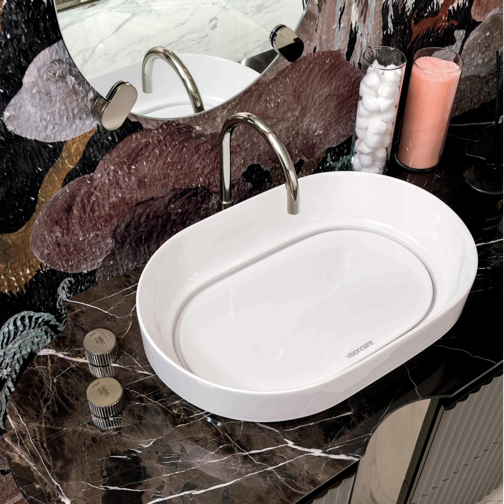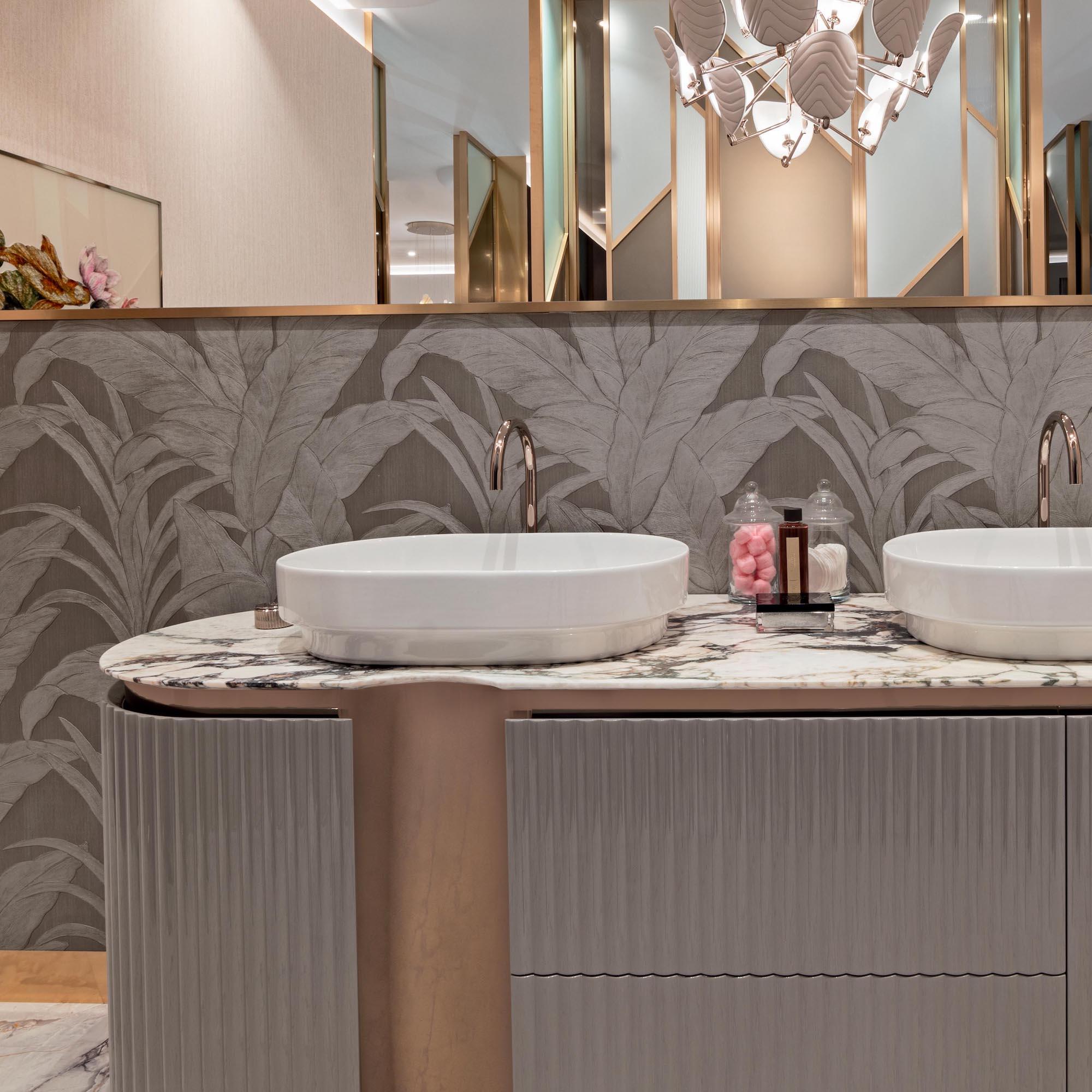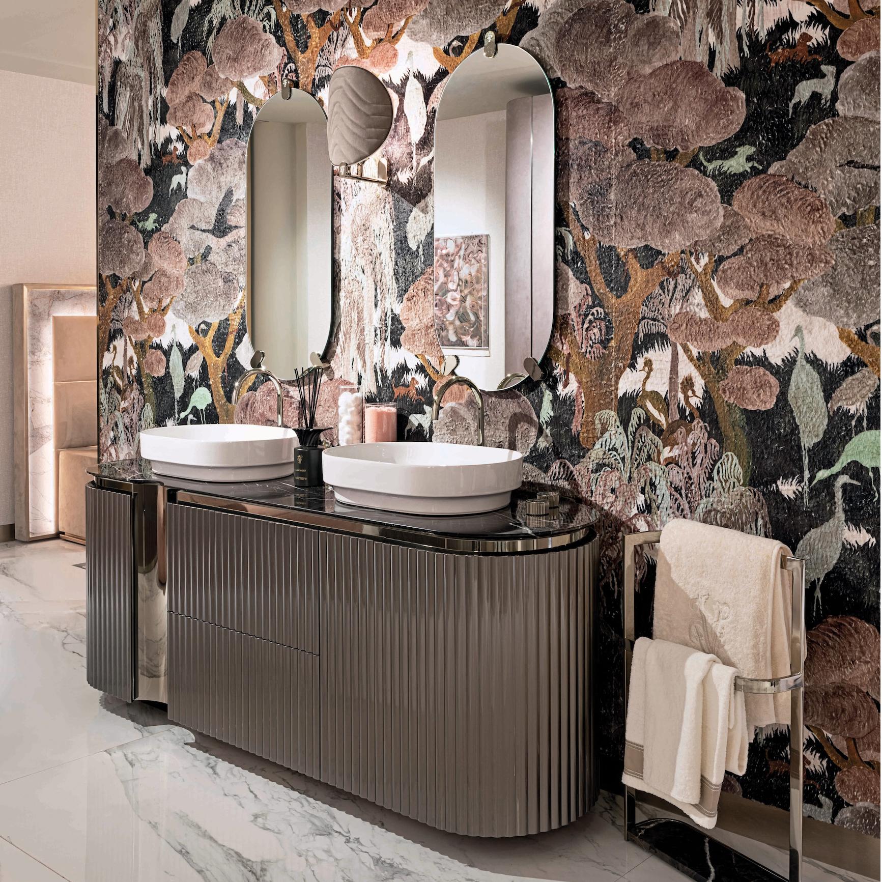 This luxurious bathroom cabinet, with its stainless steel gold base and marble countertop, dual wash basin design, meets the needs of multiple people using it simultaneously. The marble countertop provides an elegant appearance and durable surface, making it easy to maintain. The storage cabinet under the sink is designed reasonably, providing ample space for storing toiletries.