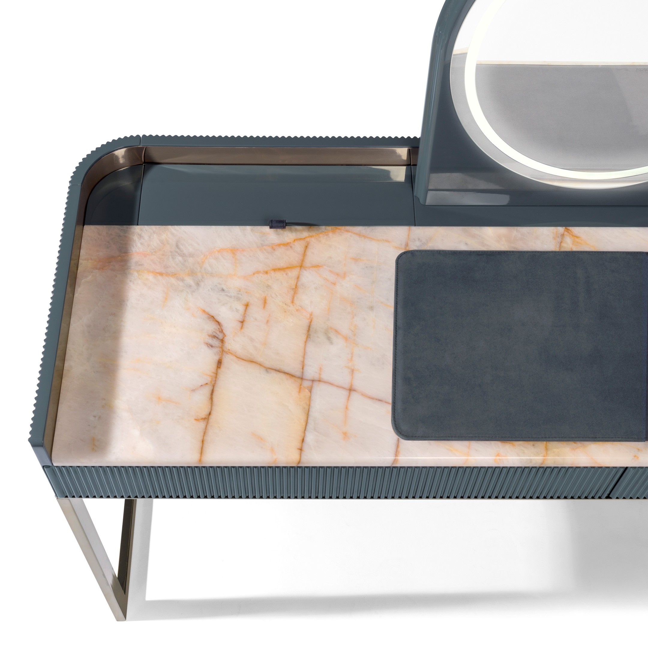 Vanity unit with chrome metal frame and lacquered wood body, defined by sculpted fluted side and rear panels with satin steel interior lining. The marble top integrates an LED-lit mirror and two concealed compartments. Discreet drawers enhance usability. Custom metallic finishes available on request.