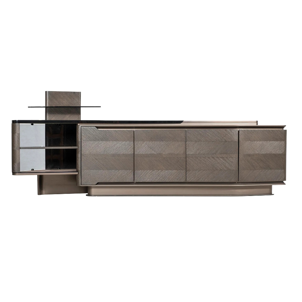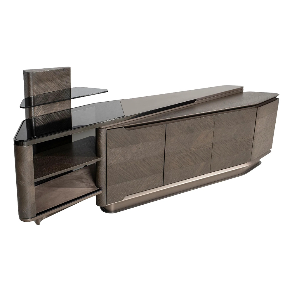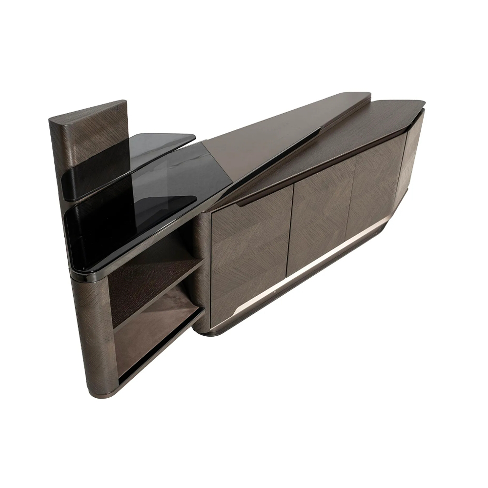 This side cabinet cleverly blends dark wood grain with metallic elements. Its smooth curved design and multi-level storage space layout are reasonable. The open platform above can be used to display exquisite ornaments, while the drawers and cabinet doors below provide sufficient storage space to meet daily storage needs.