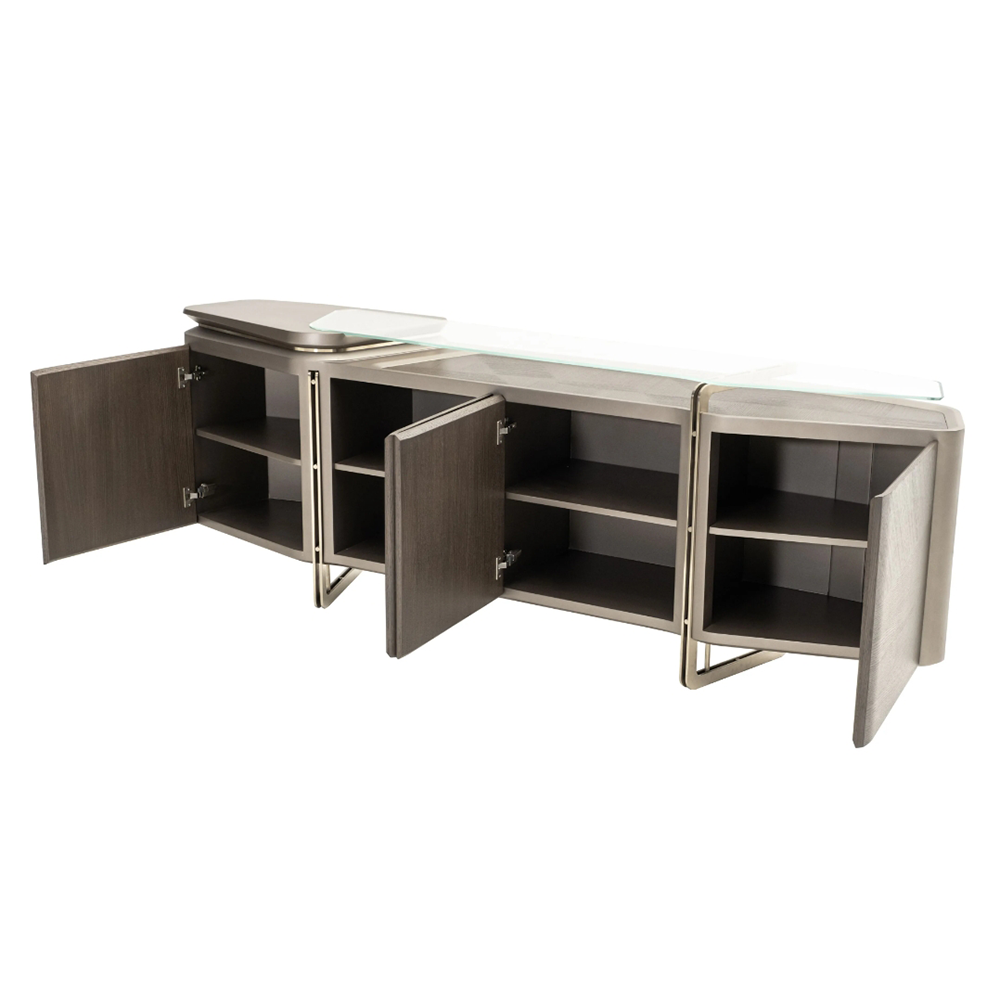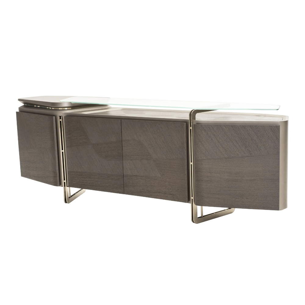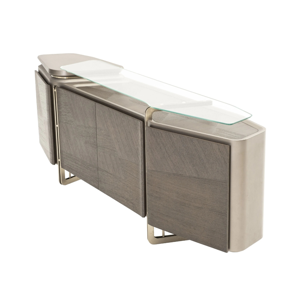 This modern side cabinet features a combination of dark wood grain and metal frame, showcasing a low-key yet luxurious modern style. The glass countertop adds transparency and the multi-layered storage space design is reasonable, meeting your storage needs.