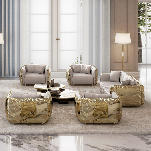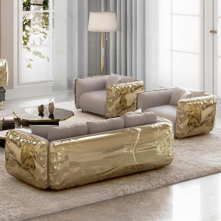 This brass style living room series perfectly blends modern luxury and classic elements, with an exquisite and atmospheric overall design that showcases unique artistic charm. The spatial layout is reasonable, combining functionality and aesthetics, with smooth lines and delicate material processing, showcasing elegant taste. The harmonious and unified combination of furniture creates a comfortable and warm living atmosphere. The clever embellishment of decorative elements adds a sense of hierarchy and delicacy to the entire space, making the living room an ideal place to showcase the owner's style and quality of life.