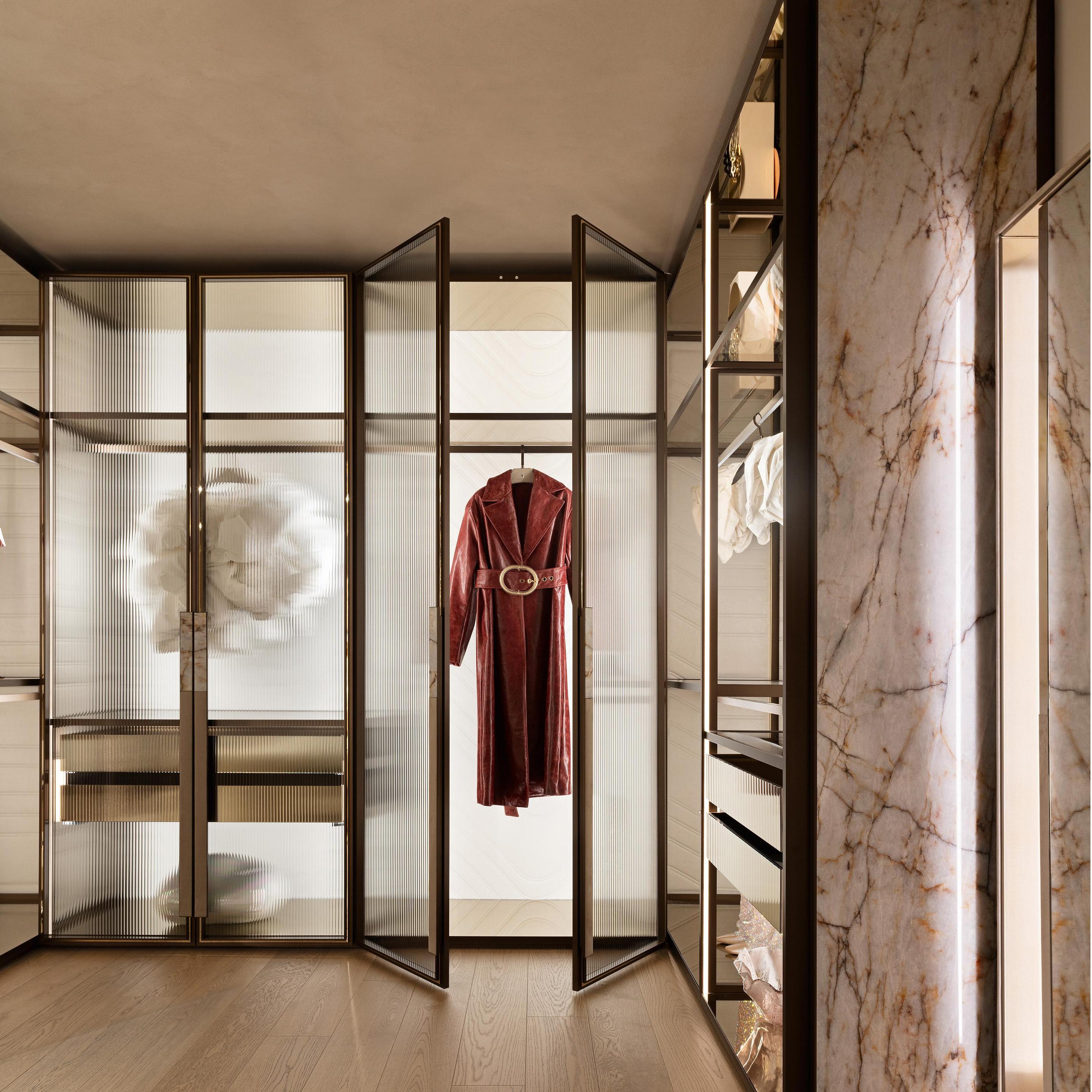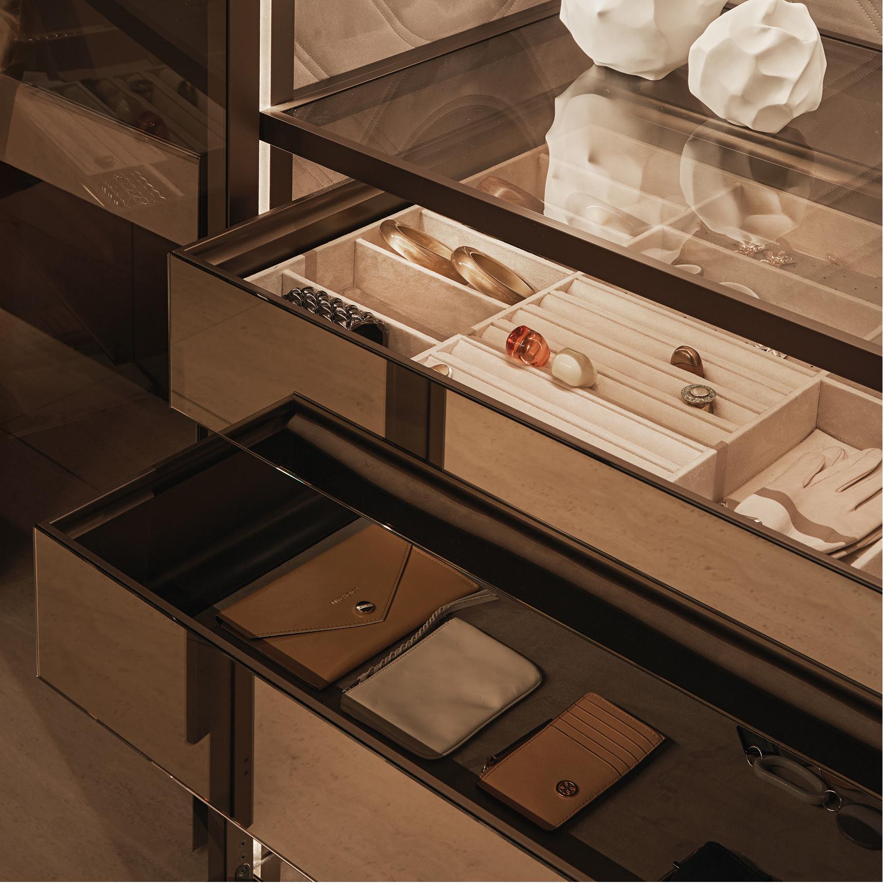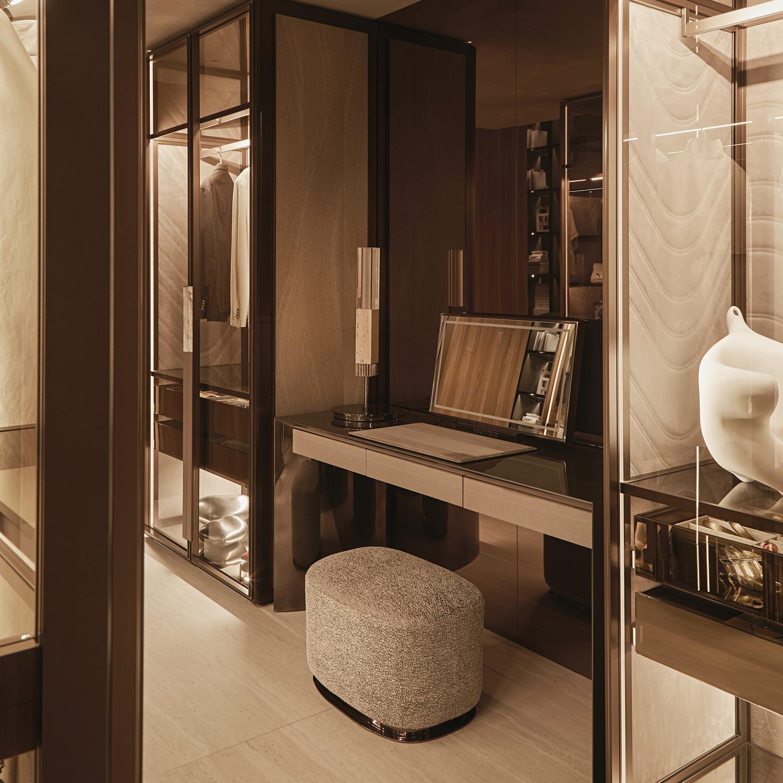 This walk-in wardrobe series perfectly blends modern luxury with practical functionality, creating a spacious and exquisite storage space. The overall design emphasizes the rationality of spatial layout, meeting the storage needs of different clothes and accessories through clever zoning and layering. High quality materials are carefully selected, with a warm touch and natural visual effects, showcasing extraordinary taste. The suspended clothes hanger and transparent glass cabinet door not only facilitate access, but also add a sense of lightness. Whether it's daily dressing or precious collection, this walk-in wardrobe series can provide you with an orderly and stylish exclusive space.