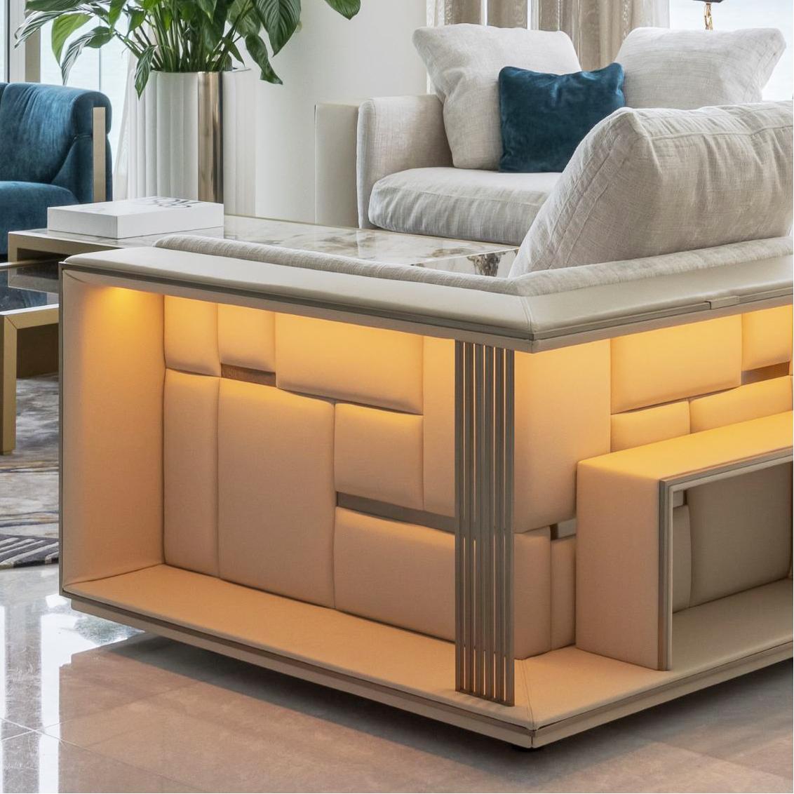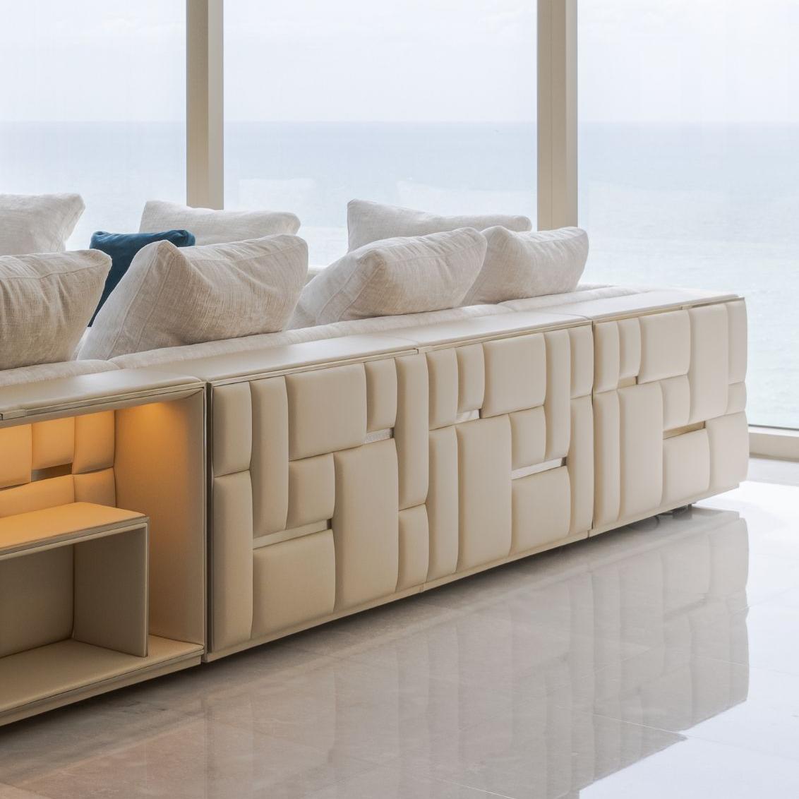 Modular sofa with sturdy wood frame and elastic webbing. Features polyurethane filling. Abstract backrest/arms with cushioned panels, steel inserts, and logo engravings. Available finishes. Features LED bookshelf, magnetic headrest, and wireless charging.