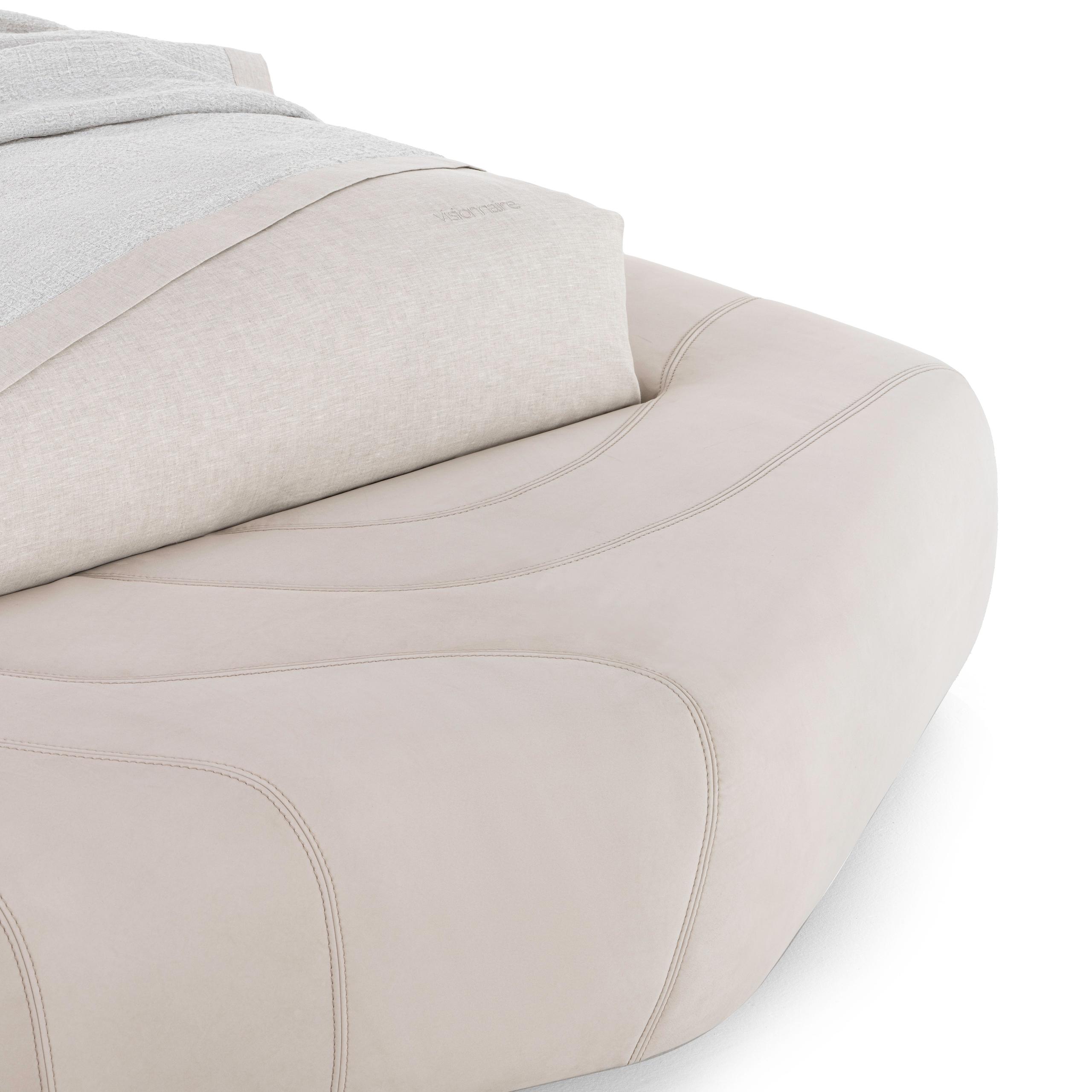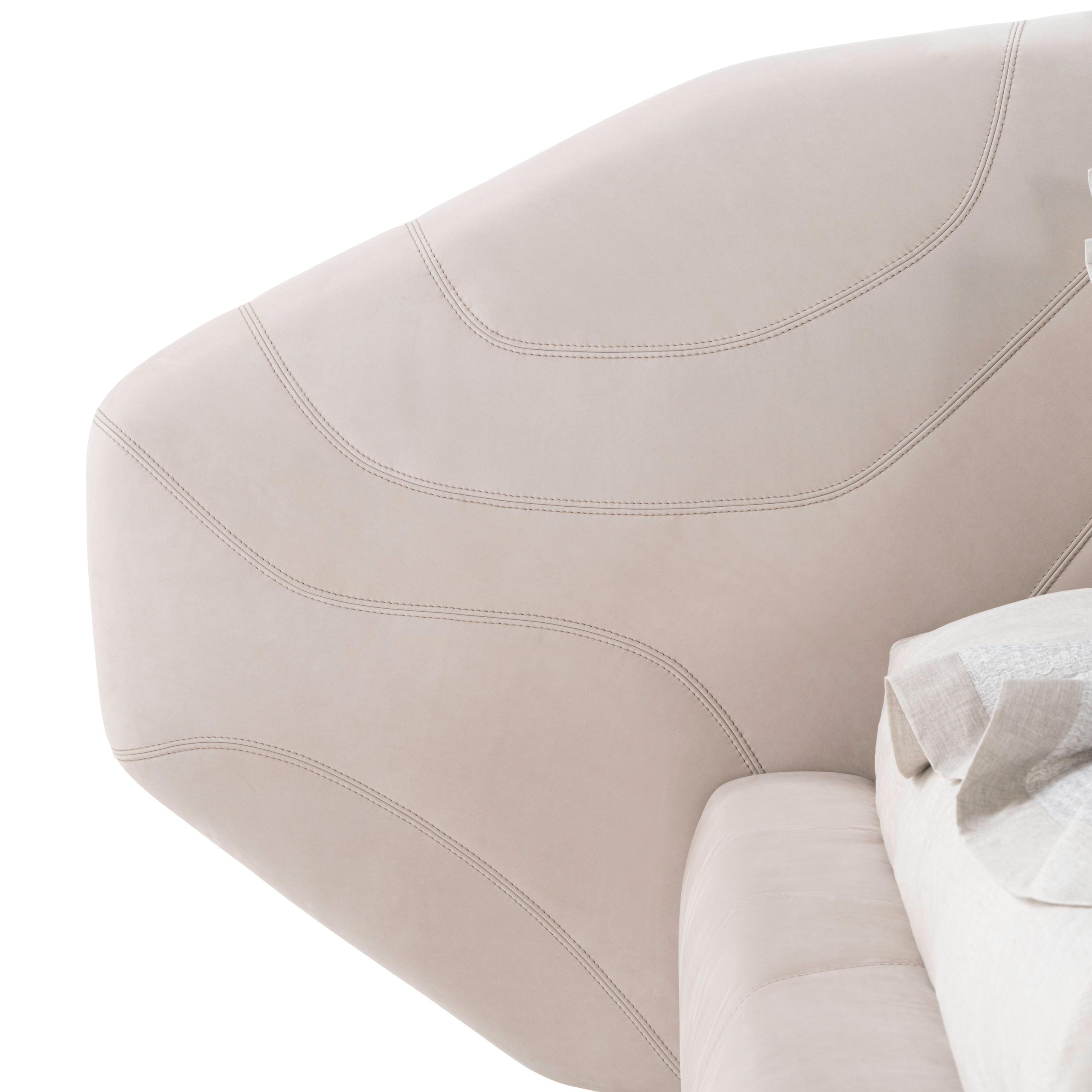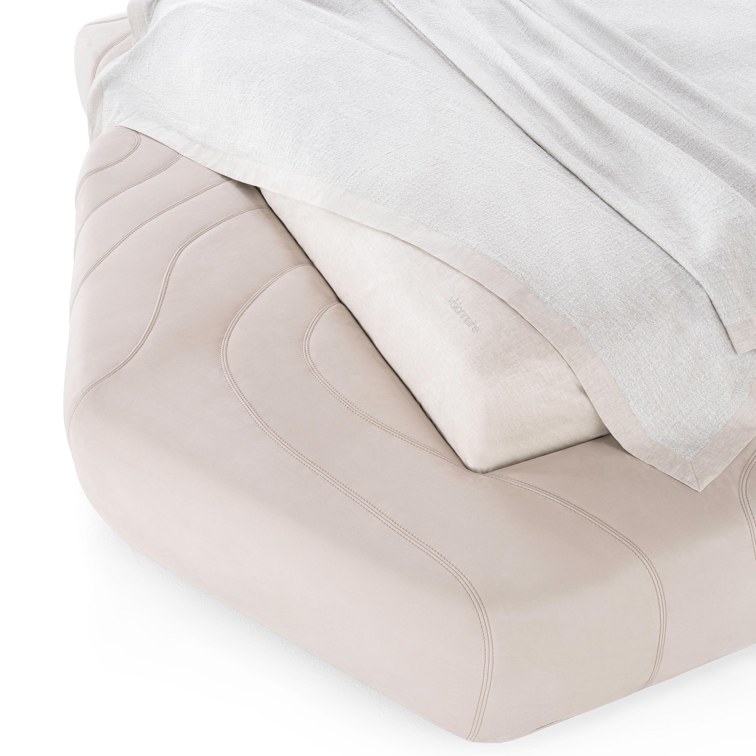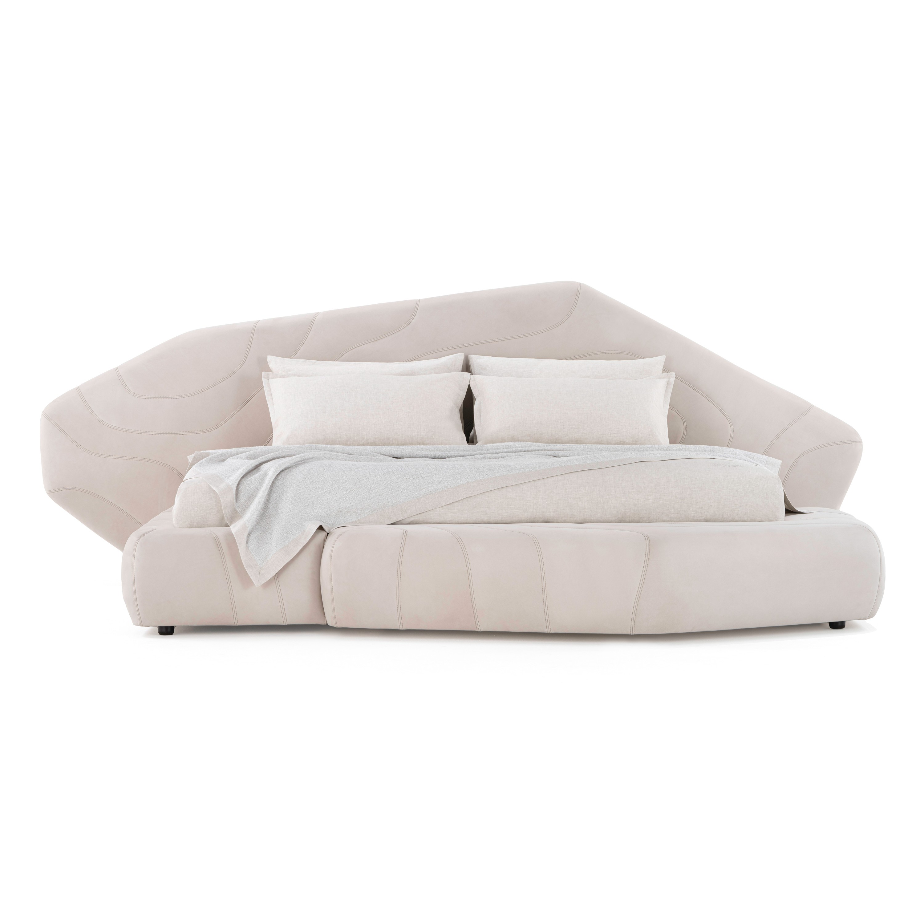 Upholstered bed in fabric or leather, with an asymmetrical headboard defined by a polygonal geometry and fully upholstered with ergonomic curvature. The internal structure in multilayer and solid fir wood is padded with multi-density polyurethane. The bed frame can be paired with a matching pouf upon request to emphasize its sculptural form. The headboard can also be fitted with integrated power sockets upon request.