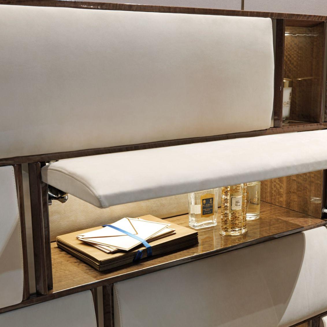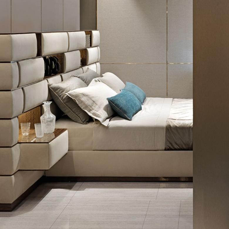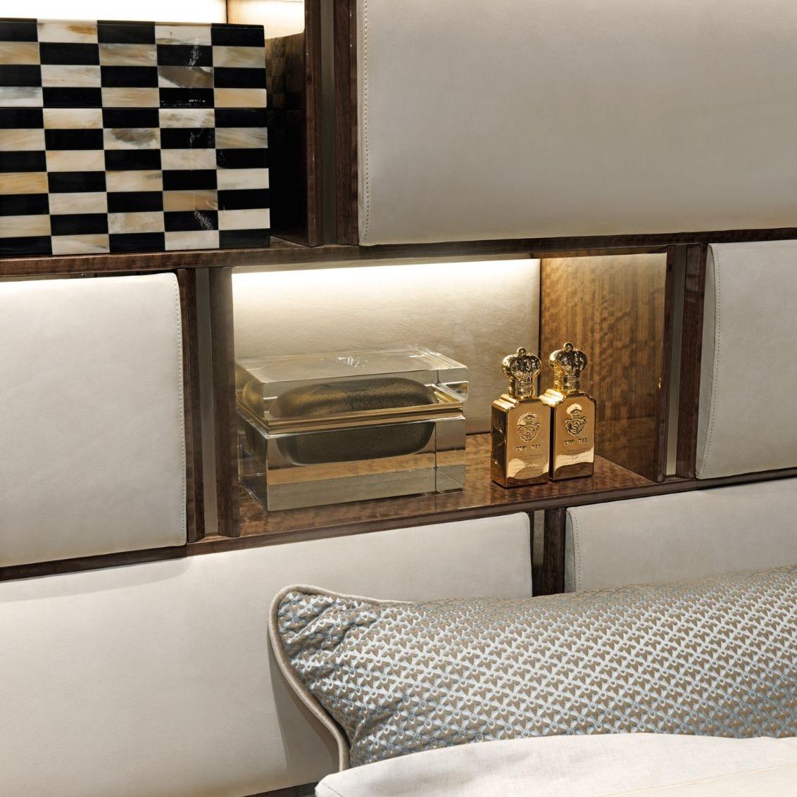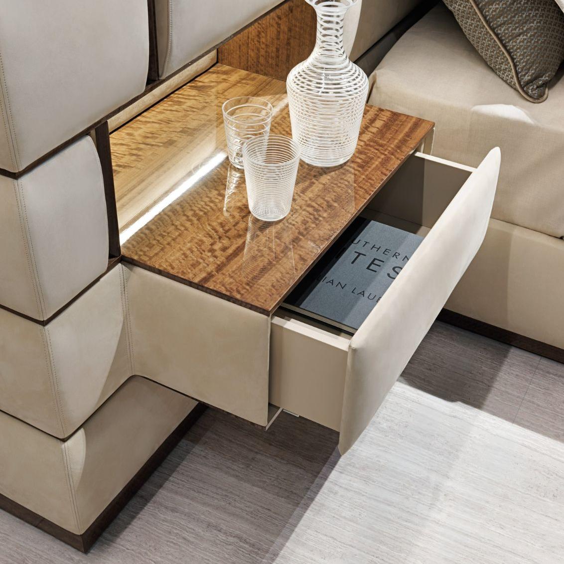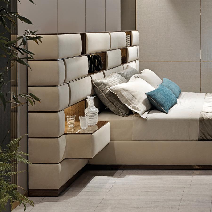 Upholstered bed in leather or fabric, the headboard includes integrated storage with high-gloss lacquered veneered wooden profiles, individually upholstered panels, open compartments with built-in LED lighting, and two drop-down compartments lined internally. The bedside tables with drawers are an integral part of the structure, which rests on a wooden plinth with satin-finished stainless steel inserts. Available in REGULAR and LARGE versions.