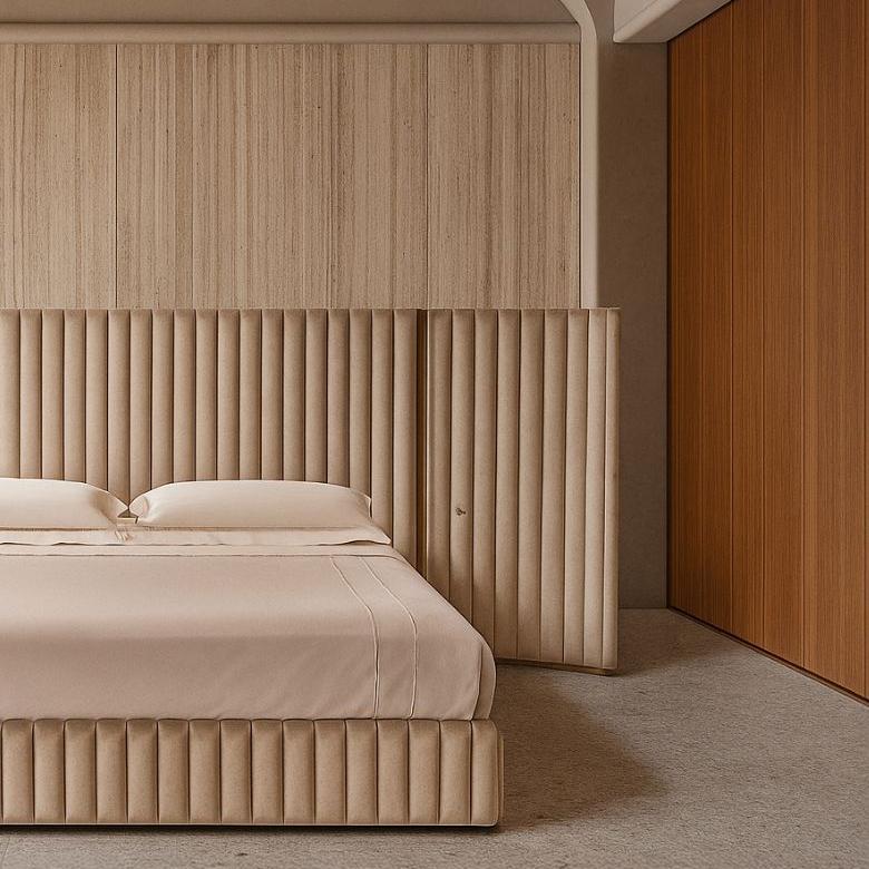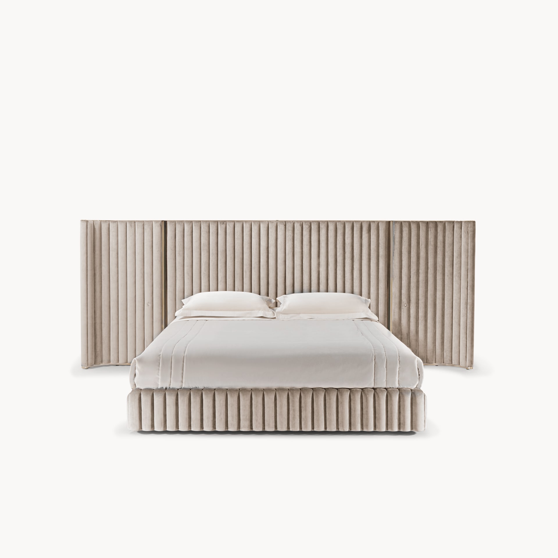 Upholstered bed in leather or fabric, featuring a poplar plywood headboard sculpted into an organ pipe design, with each element individually padded and upholstered. The thick upper frame and base in stainless steel are connected by concave metal profiles illuminated by touch-activated LED lighting. The bed frame, also padded and upholstered in sections, completes a bold and tactile composition.