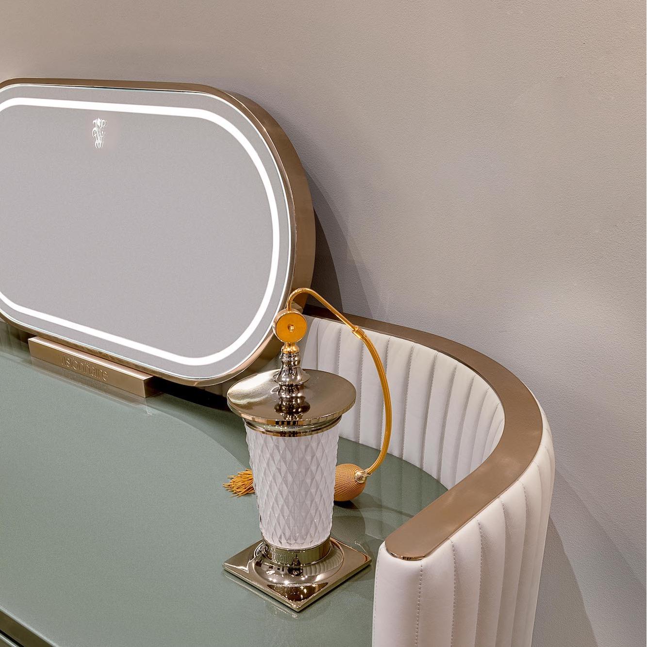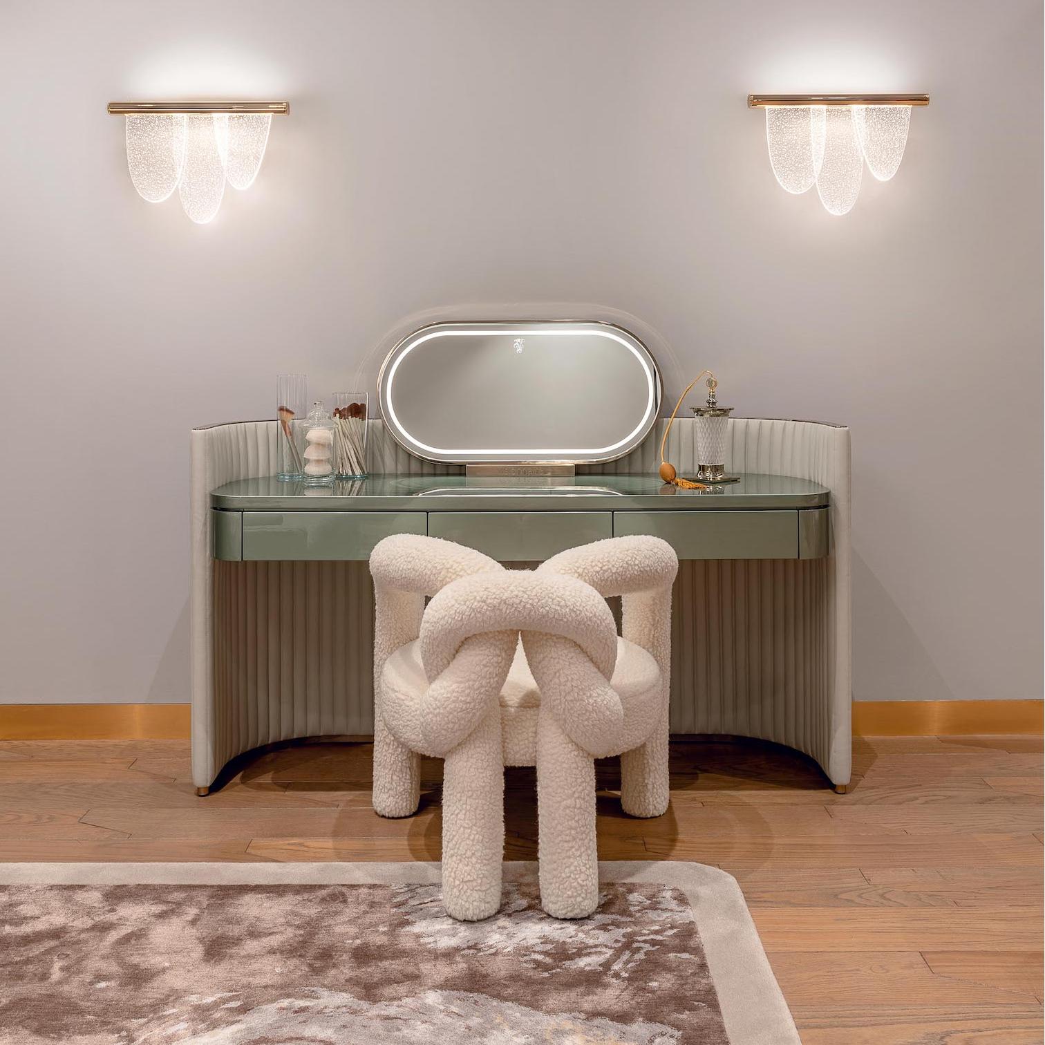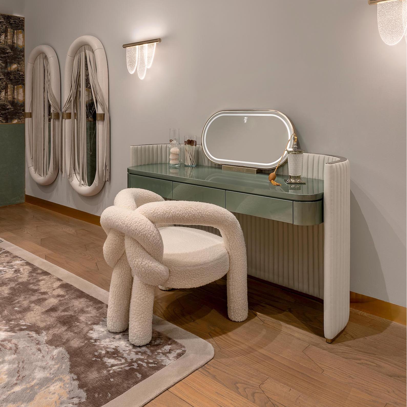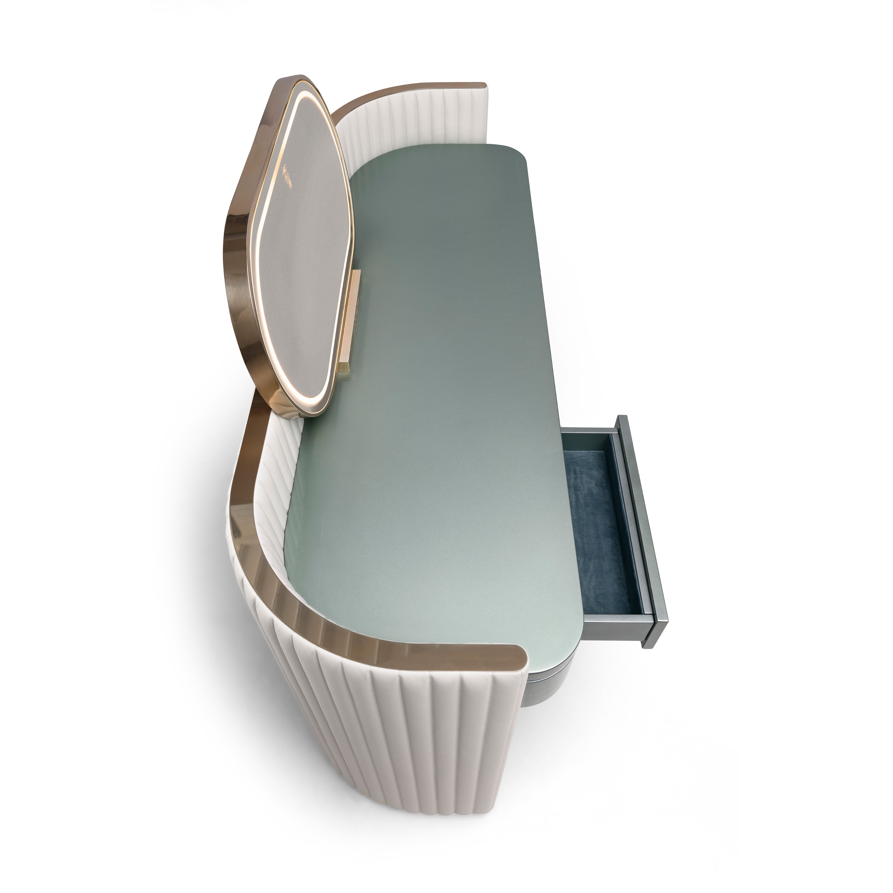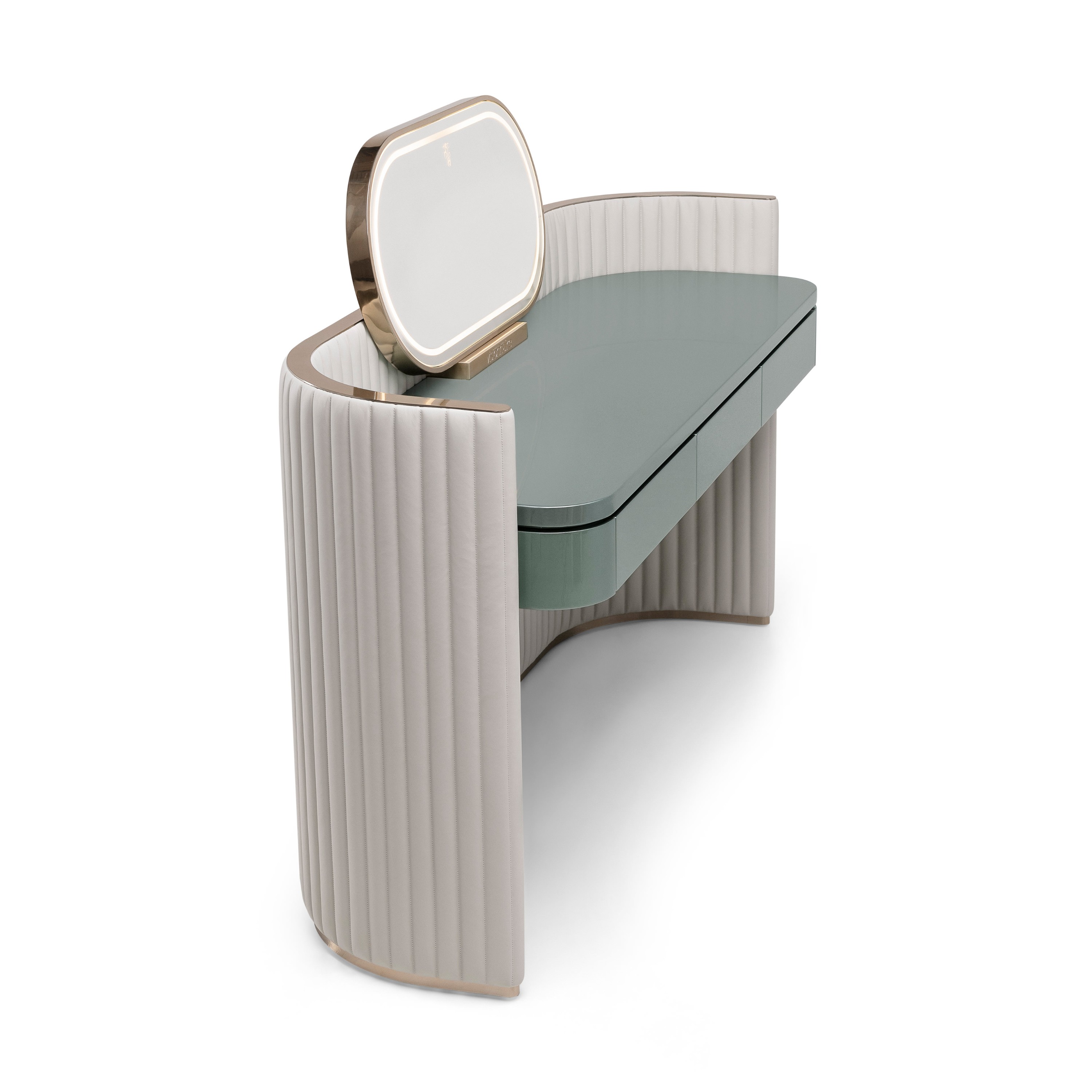 Vanity unit with multilayer structure upholstered in polyurethane, with padded organ-pipe style fluting, covered in leather or fabric. The lacquered top includes three drawers, connected to a thick steel base and upper frame. The oval mirror with curved metal frame and LED backlighting completes the set. Custom metal finishes available.