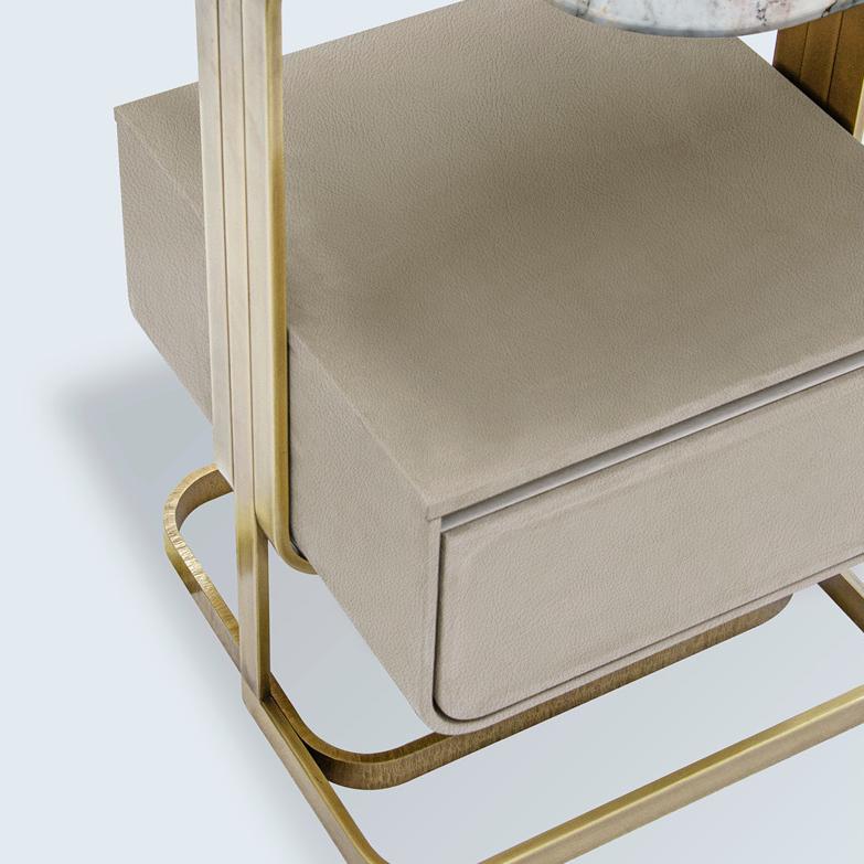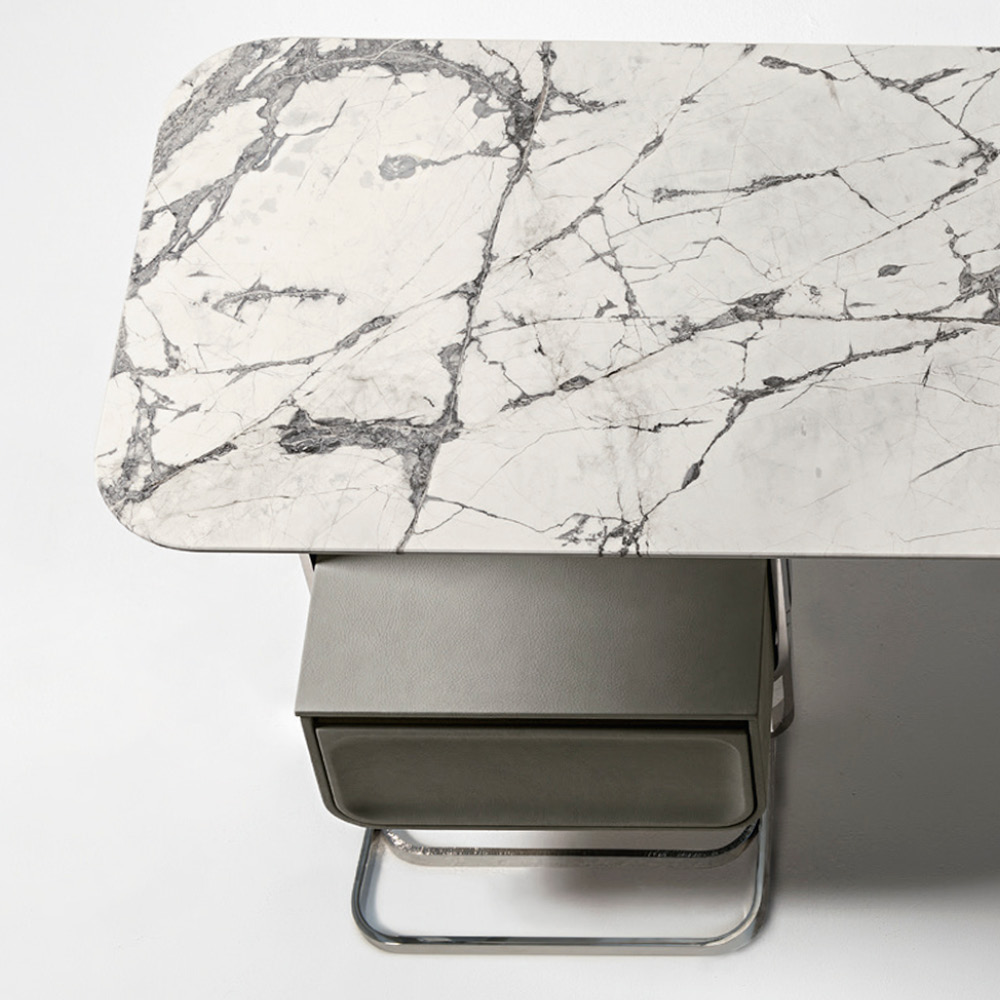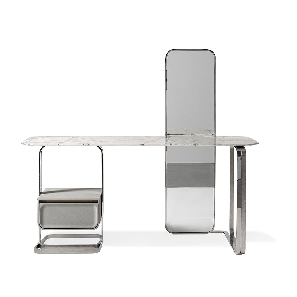 This dressing table is designed specifically for female customers and is their exclusive space for makeup. It adopts a dual ring metal base, with the metal in a flat ring shape and two treatments of glossy or matte finish. The handmade sculpture effect is unique. The drawer is wrapped in soft leather with exquisite details.