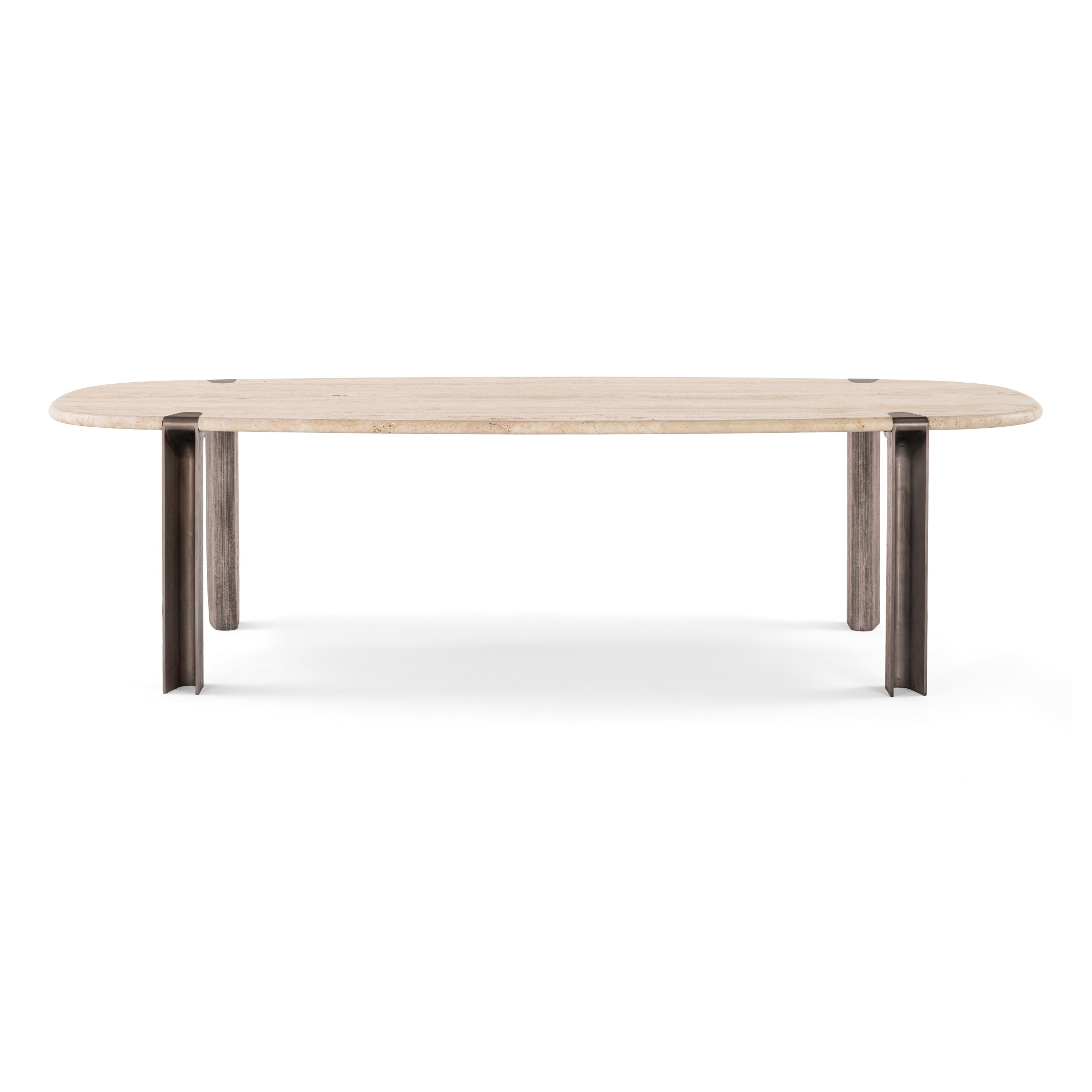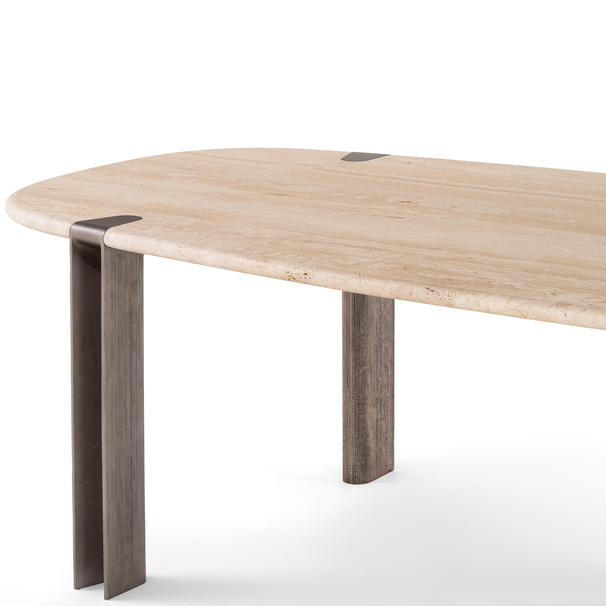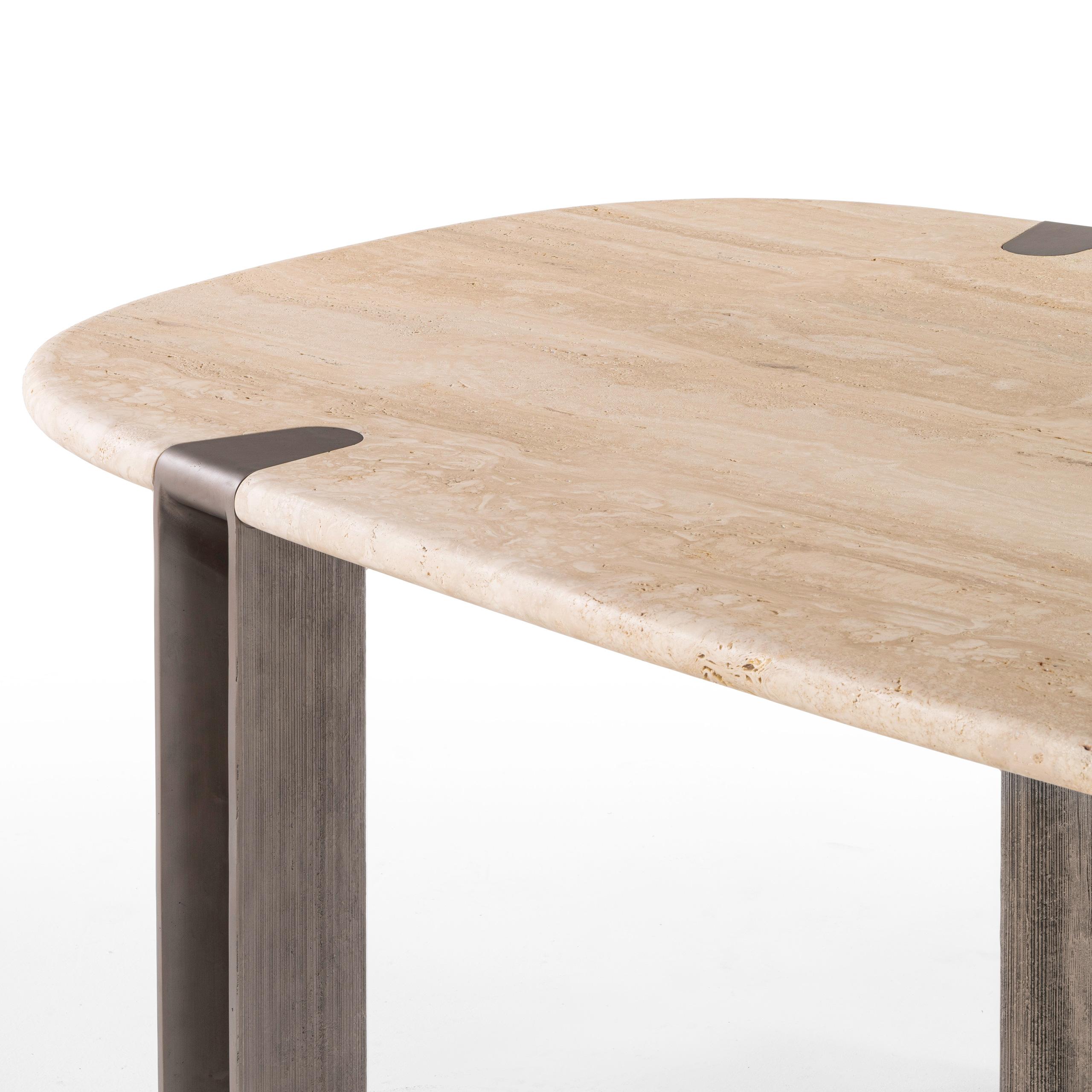 Table with thick travertine top shaped with a bullnose edge and matte open-pore finish. The legs, cast aluminum with a concave section, are polished inside and hand-textured outside with a scratched pattern. The under-top is painted metal. Also available with a thinner marble top and metal under-top, or with a high-gloss lacquered wood top in RAL/NCS colors. Metal finishes selectable from the collection.