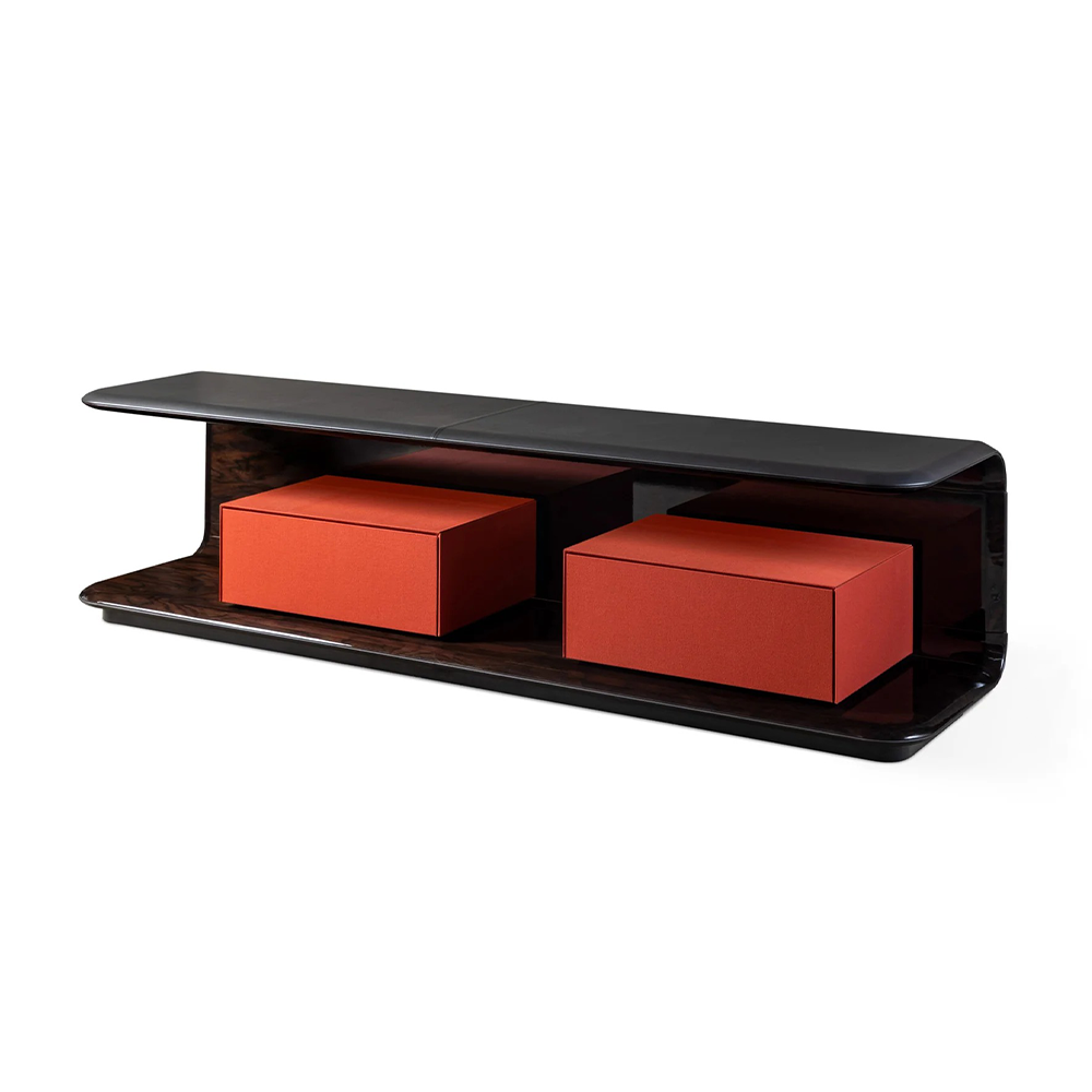 The leather soft pack structure of this cabinet is elegant, with excellent materials for the interior and drawers, including wood, leather, and soft cashmere. Upon request, a top lighting system can be provided.