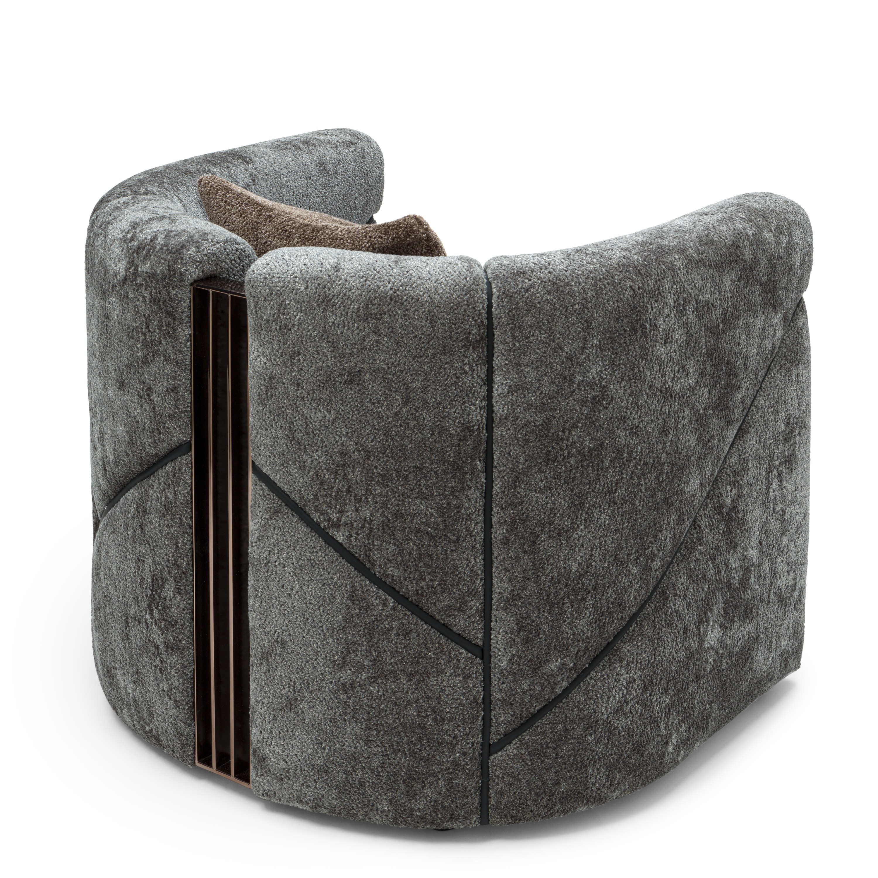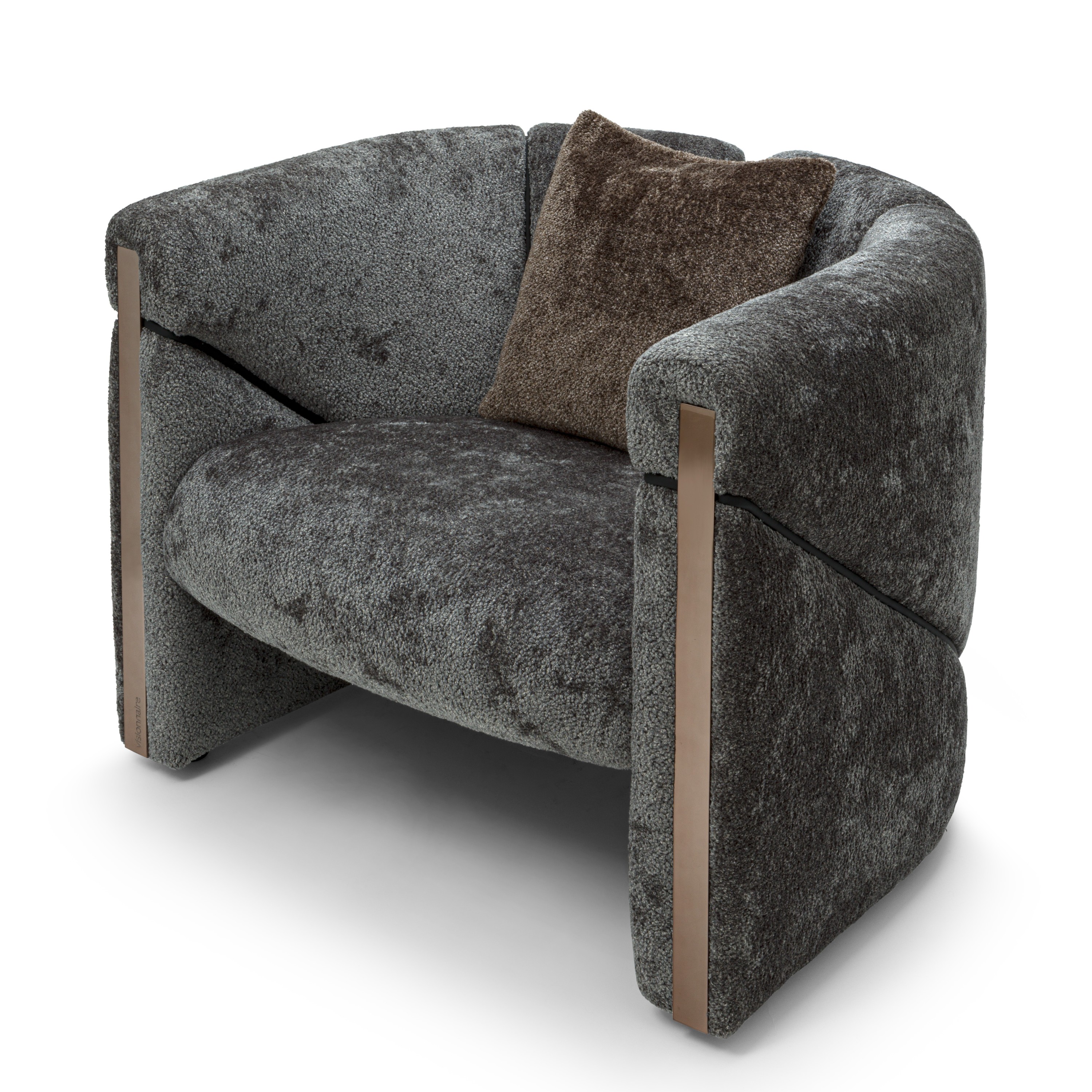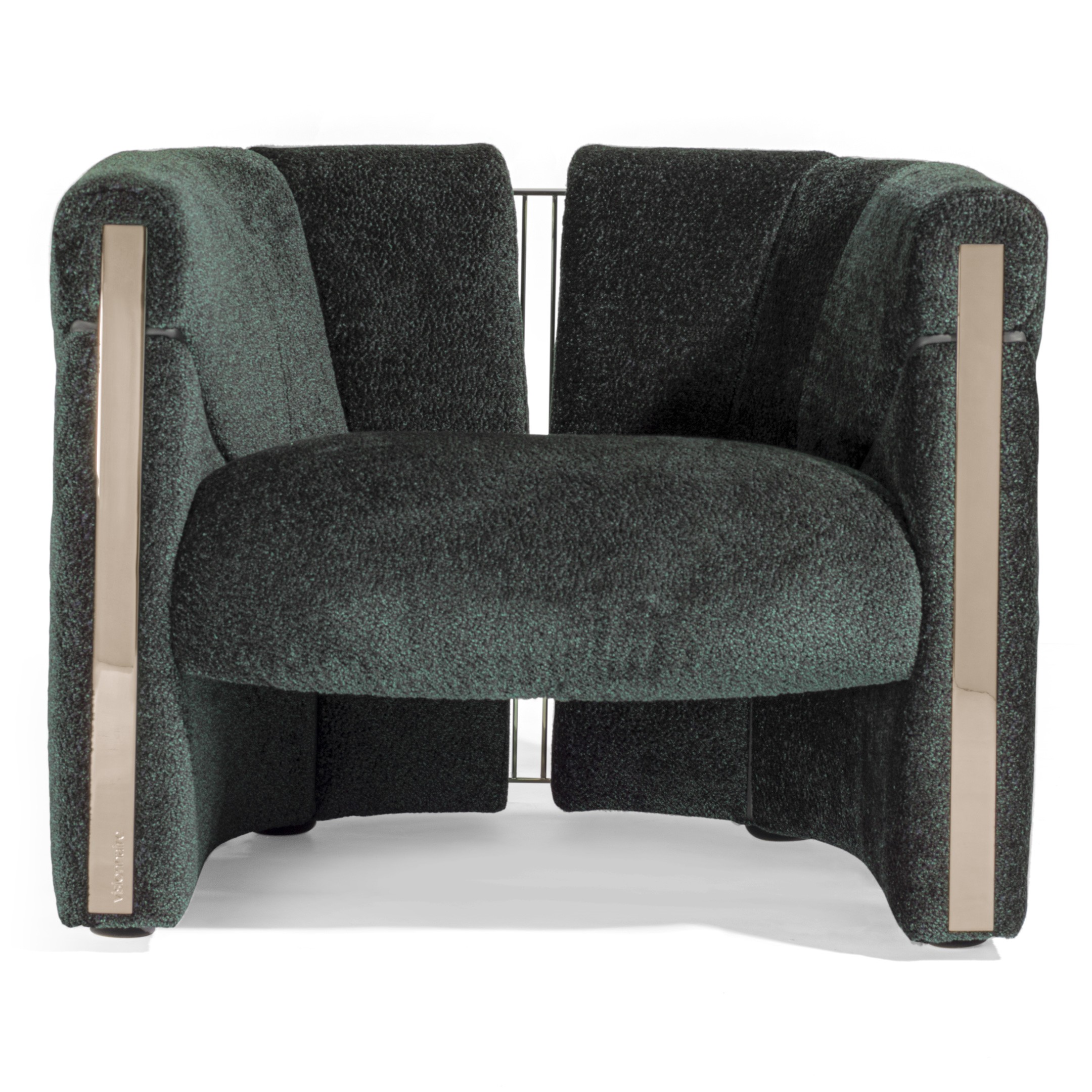 Armchair upholstered in leather or fabric, with a curved wooden shell that embraces the seat, supported by integrated elastic webbing. The backrest and armrests are accented by vertical stainless steel elements, emphasizing an architectural rhythm. The exterior upholstery features a geometric design with Soft Leather piping, adding a refined graphic touch.
