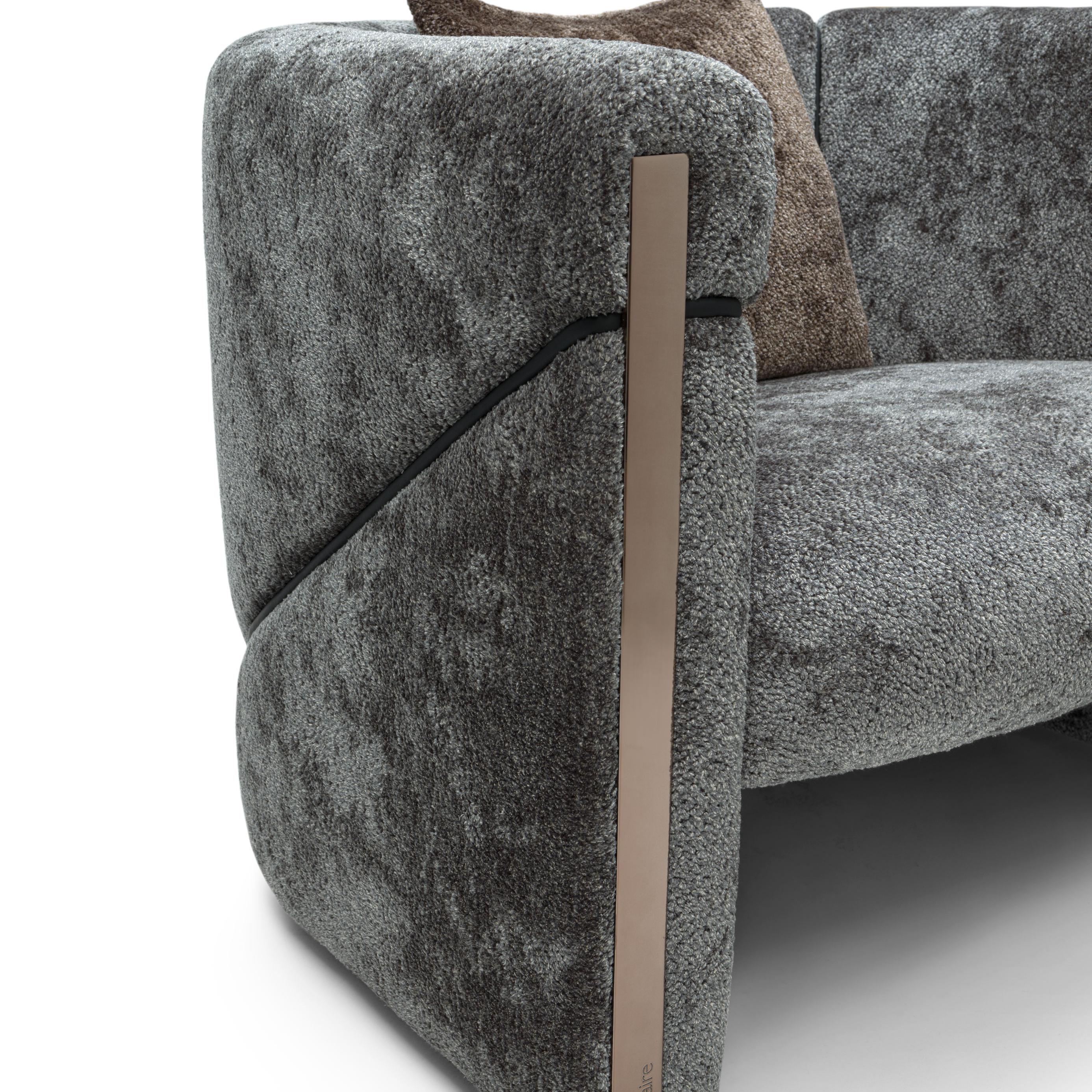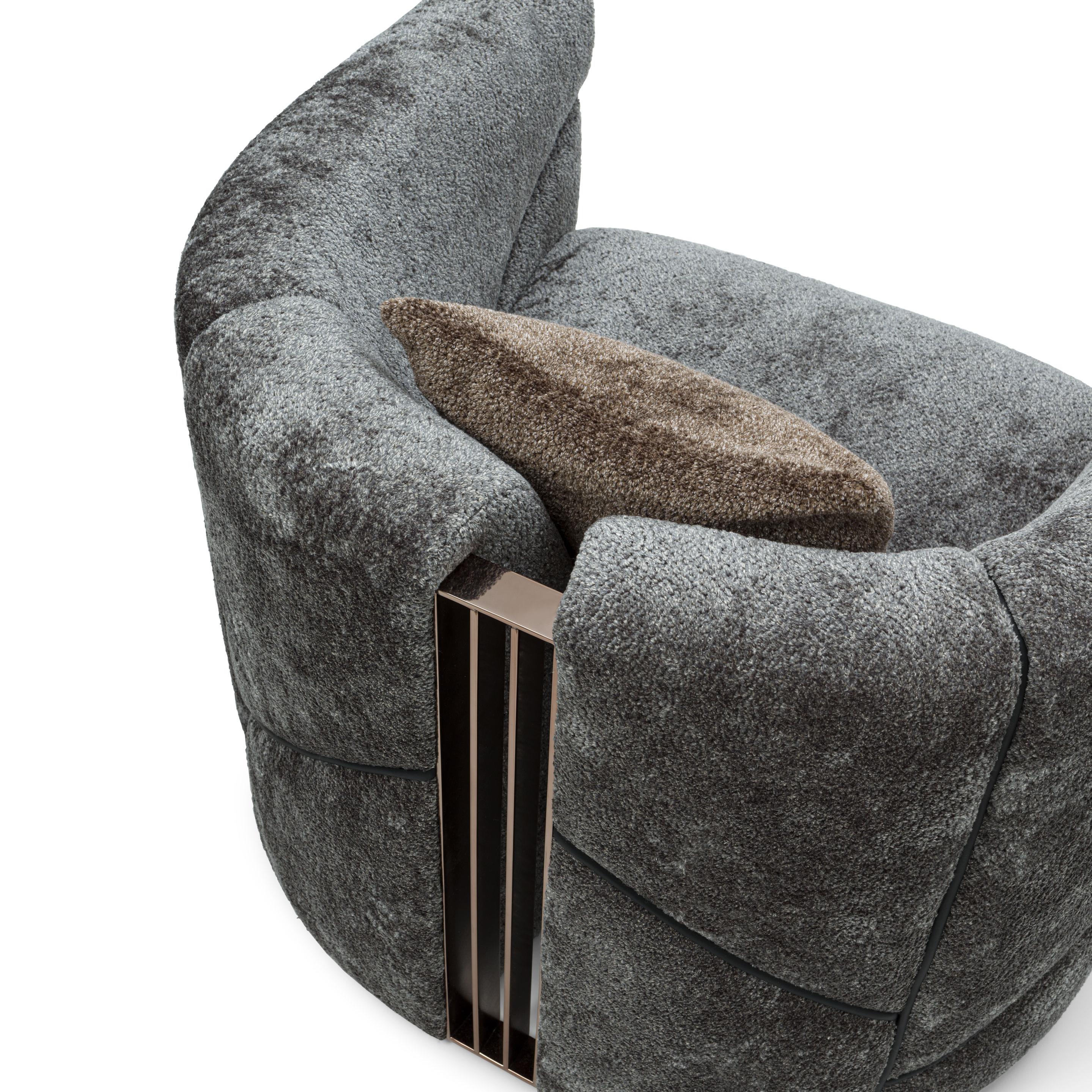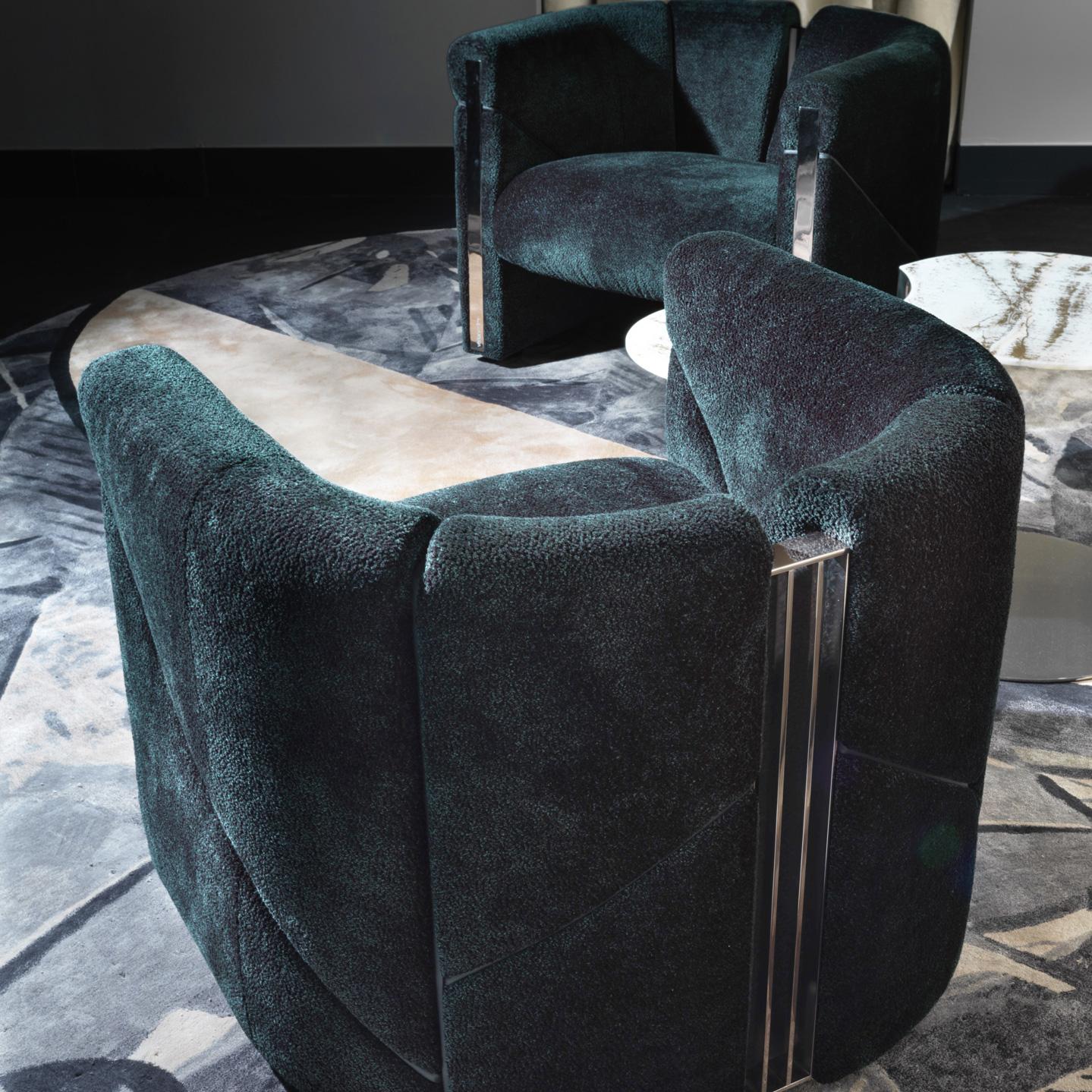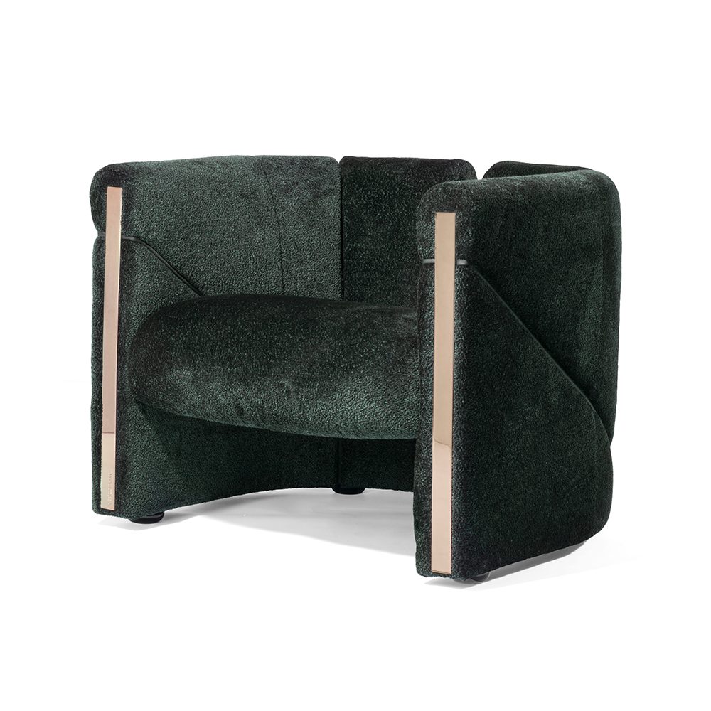 Armchair upholstered in leather or fabric, with a curved wooden shell that embraces the seat, supported by integrated elastic webbing. The backrest and armrests are accented by vertical stainless steel elements, emphasizing an architectural rhythm. The exterior upholstery features a geometric design with Soft Leather piping, adding a refined graphic touch.