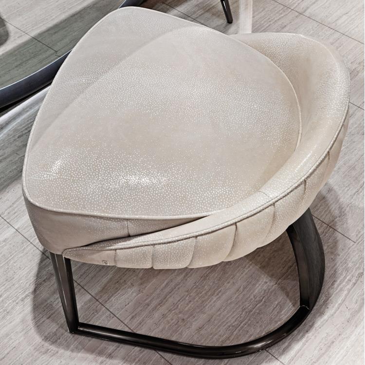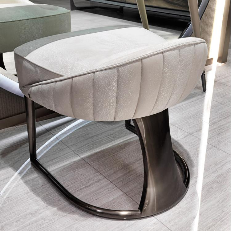 Upholstered pouf with a structure in solid and multilayer poplar wood, with seat and backrest shaped in multi-density polyurethane. The upholstery contrasts smooth leather or fabric surfaces with a refined canneté texture on the outer backrest. The satin-finished steel base completes the piece and is available in selected metallic finishes.